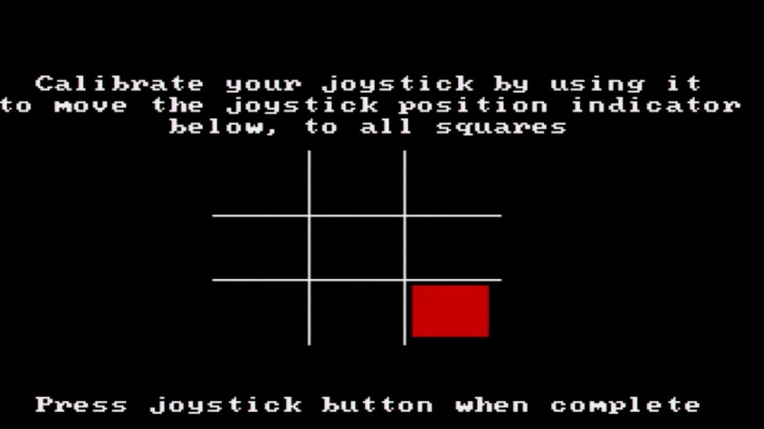 There is no separate joystick calibration utility, but once the game has loaded you can press Ctrl-J at any time to bring up the calibration feature. This will ask you to move the red box into each of the other dark boxes, and when you are happy the joystick is centered, press one of the buttons.