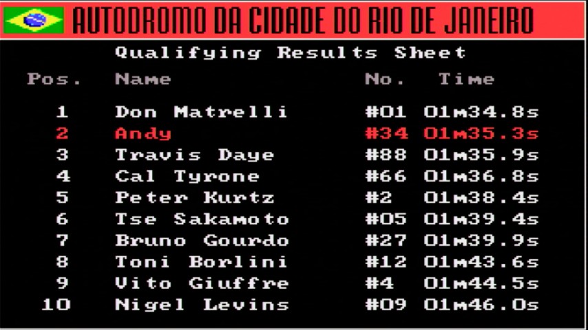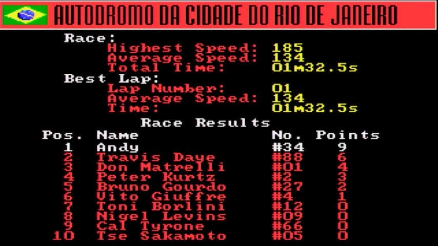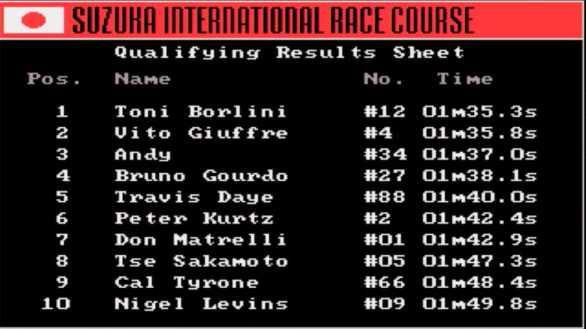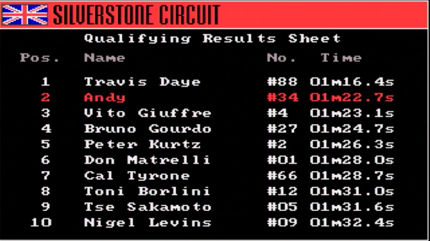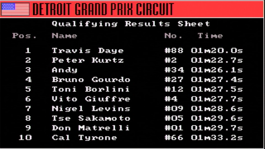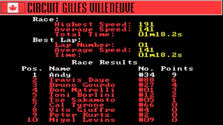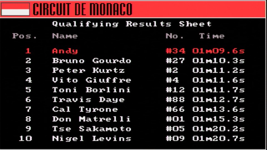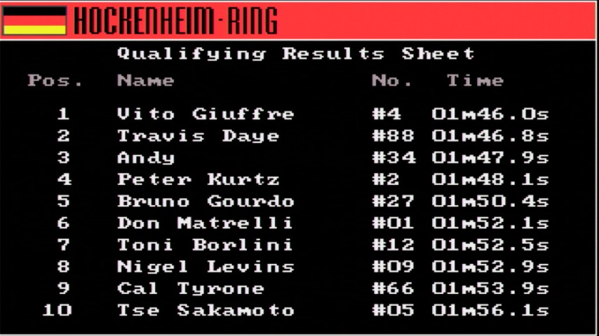 All in all, Grand Prix Circuit was by far the best arcade-style Formula 1 simulation available for the PC at the time it was introduced. It was easy to get into for beginners, but fiendishly difficult to master at the higher skill levels. The other driver AI is also good, with each opponent having their own 'style' of driving, which you can get to learn. Don't expect a full-on sim here, though - there are no tyre temps, camber settings or downforce settings in sight. Nor are the drivers named after true Formula One drivers (you can see they are a take on the game's authors).
