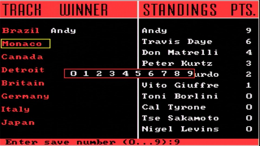 You can only save your game when in a Championship. At the end of each race when you are presented with the Standings table, press F1 to Load from, or F2 to Save to, any one of ten save game slots. Just press the number from 0 to 9 and hit <Enter> to confirm.