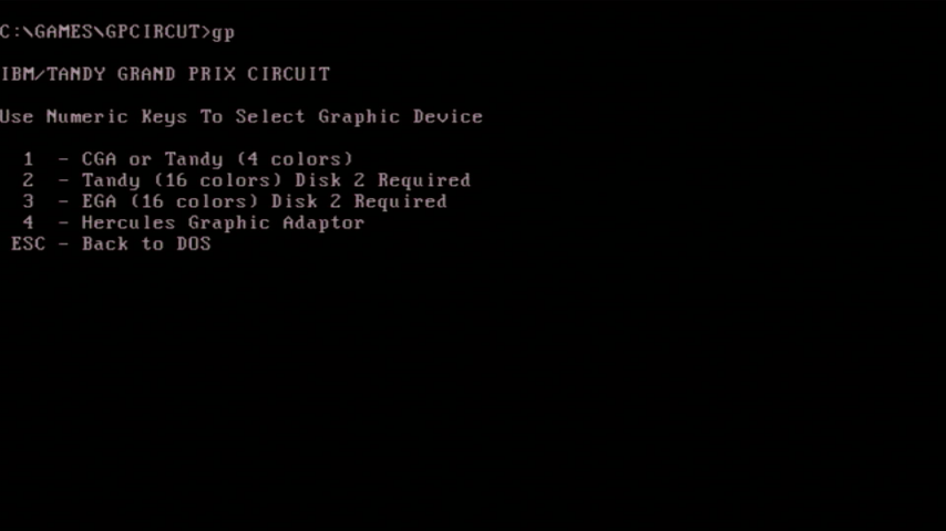 There is no setup utility for Grand Prix Circuit. You can run the game using the GPCGA.EXE, GPEGA.EXE or GPTDY.EXE files, which will run the game in that graphics mode, but if you start the game by running gp.exe, you are presented with this set of options: