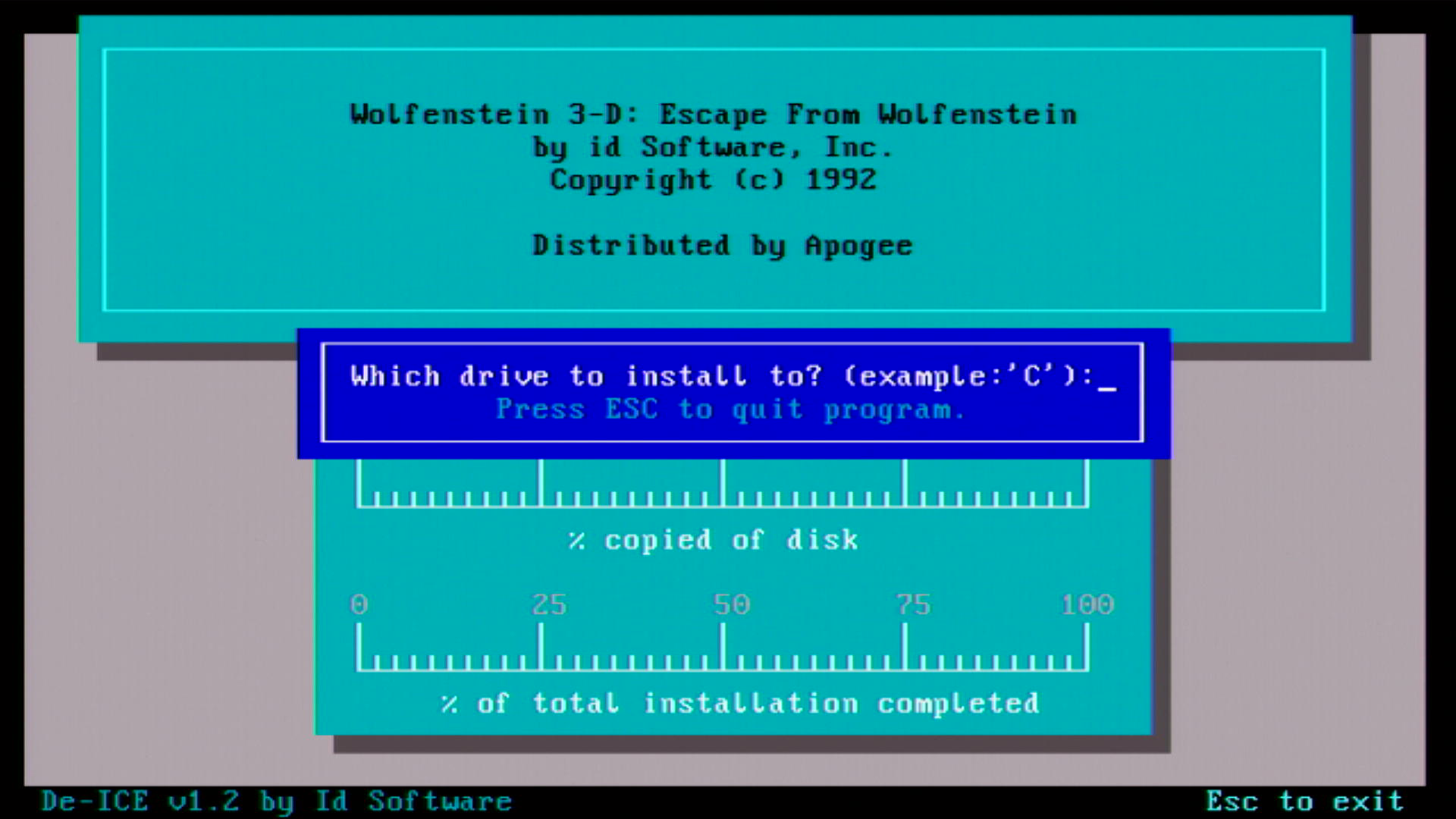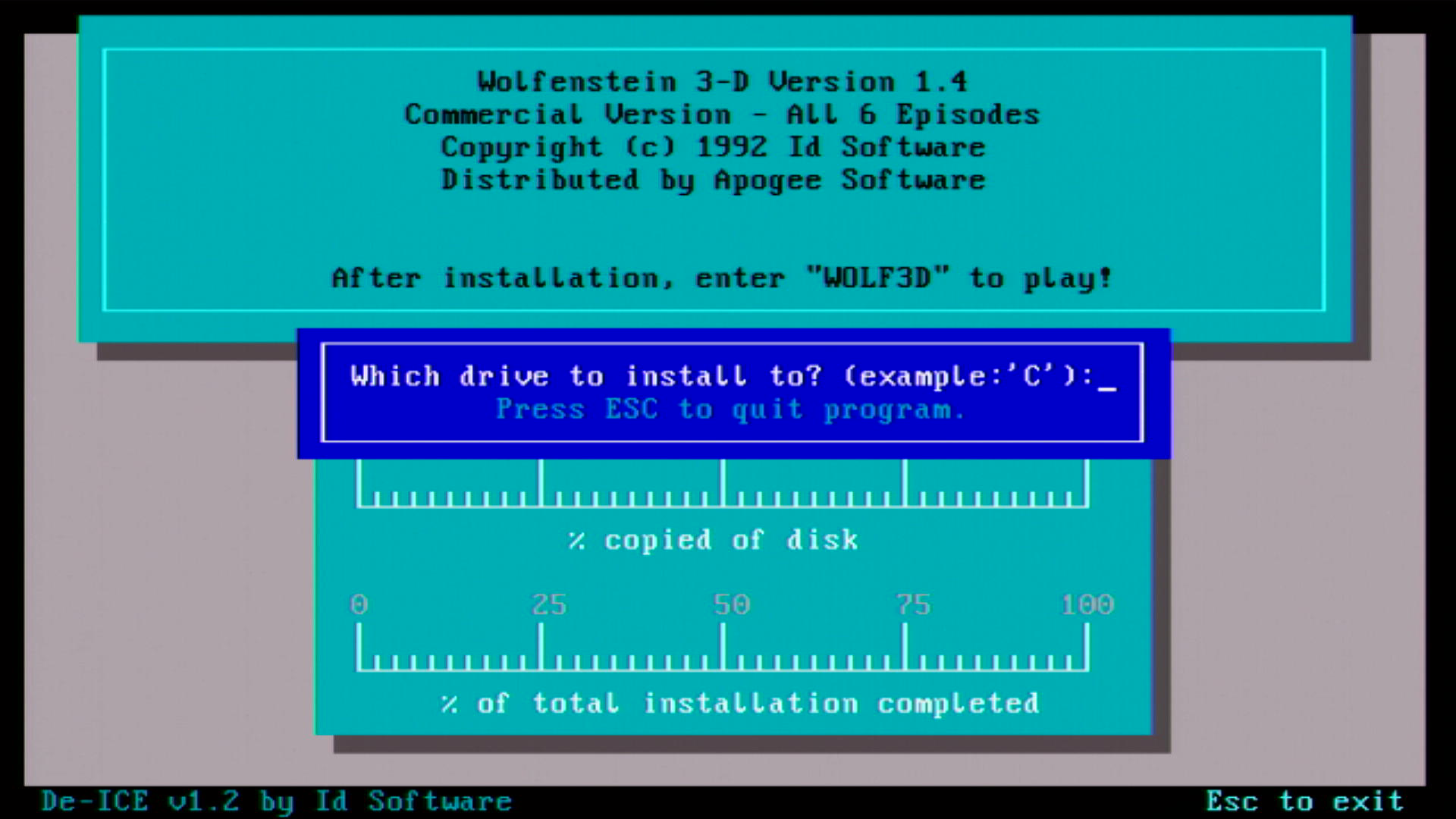 Wolfenstein 3D must be installed to your hard disk. To do so, run INSTALL.BAT from the first floppy disk.