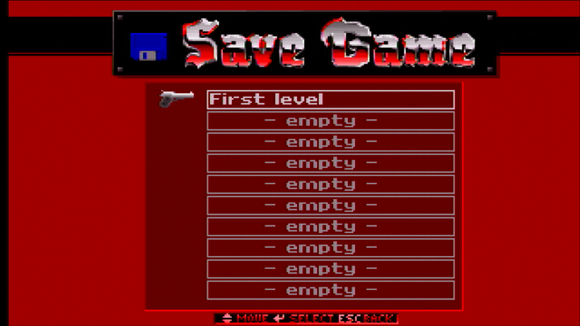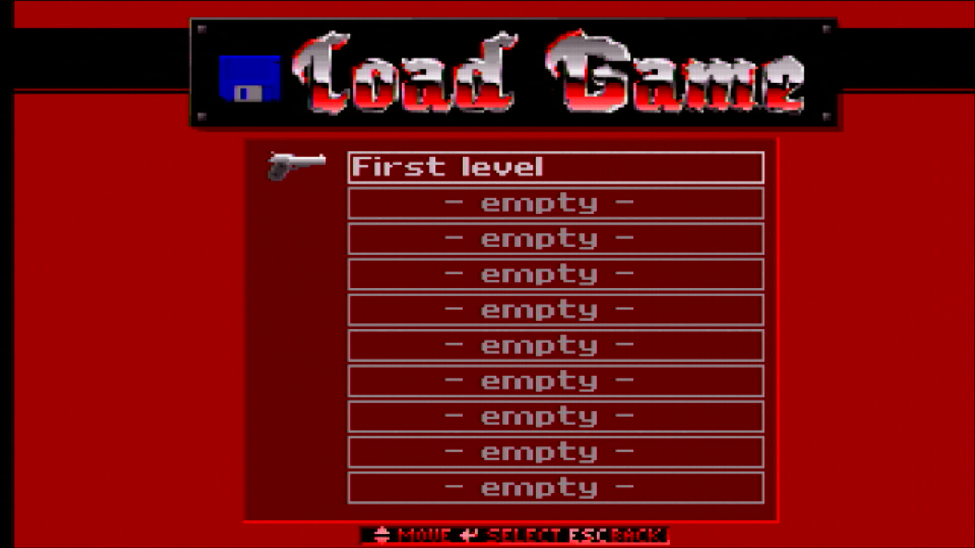 You can reload from this at any time by pressing F3 to bring up the 'Load Game' screen which shows all the save game slots. Move the cursor to the one you want to load, and press <ENTER>. Just like 'quick save', you can 'quick load' from that previously saved game by pressing F9 to avoid bringing up the 'Load Game' screen.