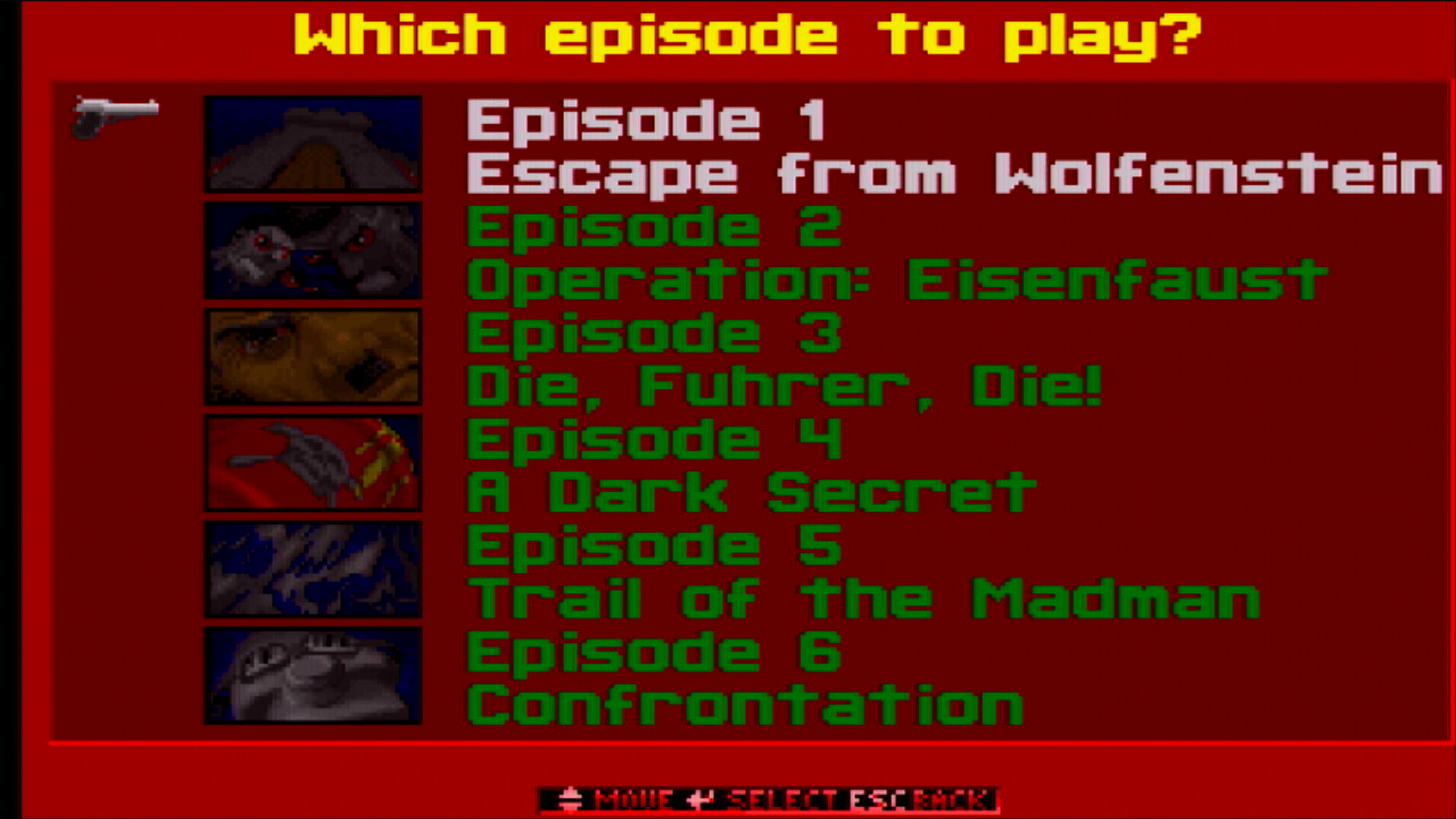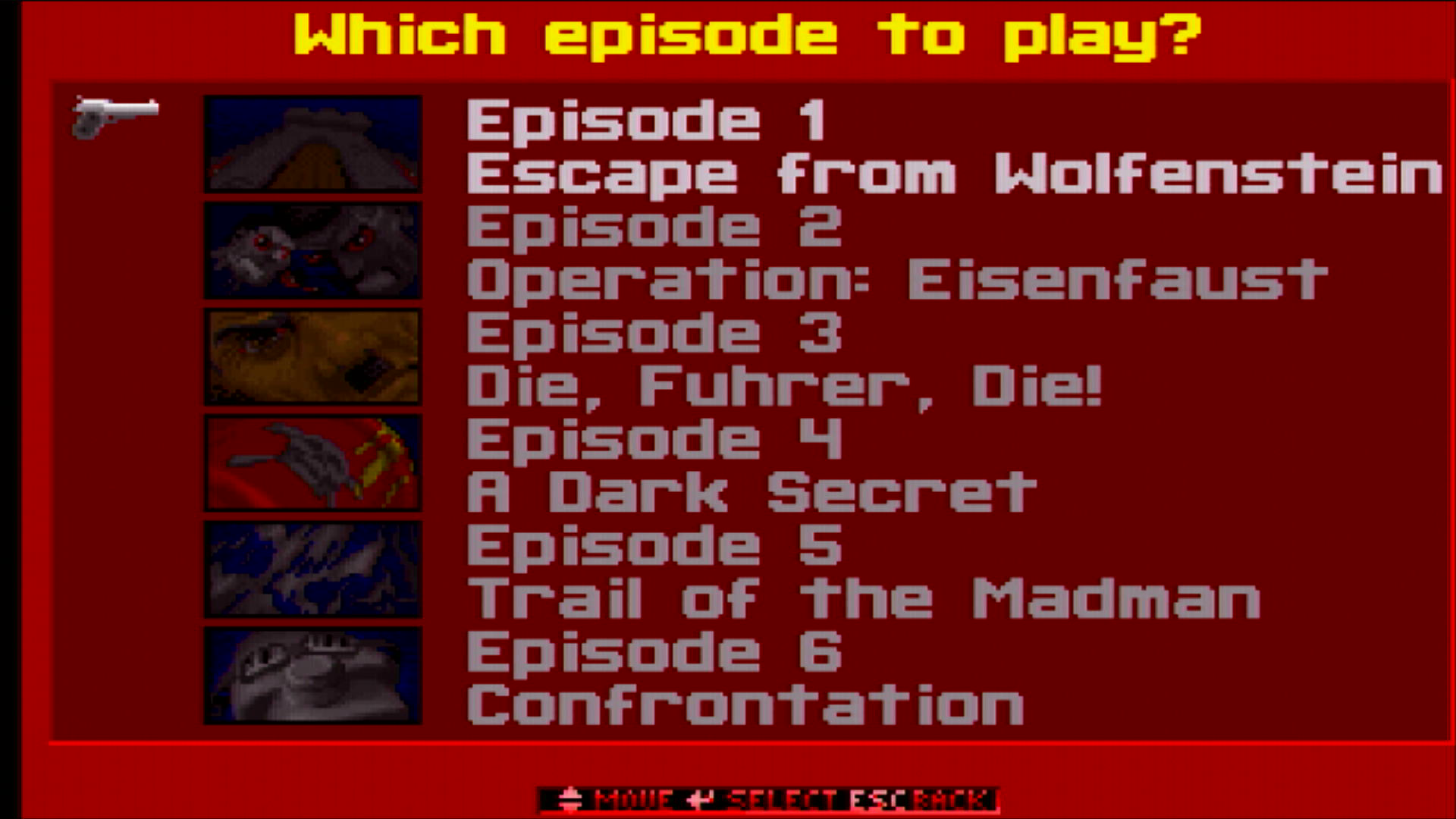 The full game added Operation: Eisenfaust (episode 2), and Die, Fuhrer, Die! (episode 3). You could also order three more episodes of Wolfenstein 3D directly from Apogee Software: Called The Nocturnal Missions, this was a prequel where B.J. Blazkowicz must stop a Nazi plan for chemical warfare. It added these episodes: