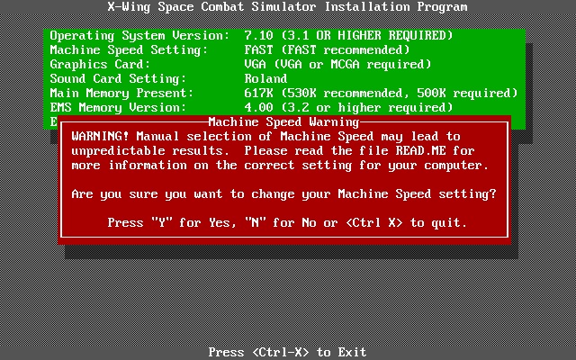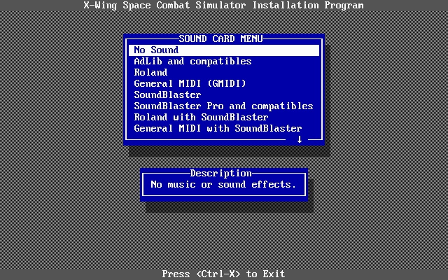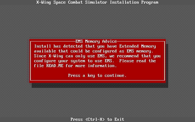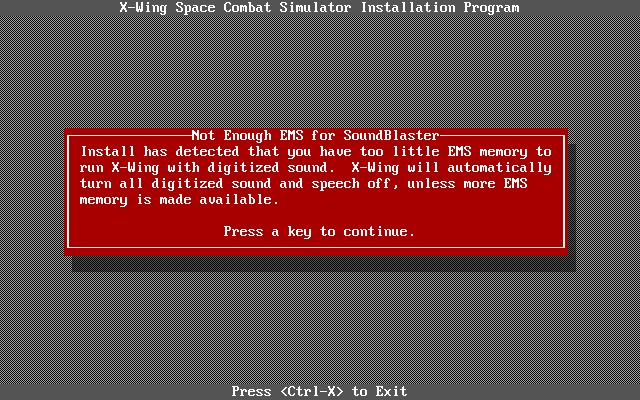 Star Wars: X-Wing requires EMS (Expanded Memory) 3.2 or higher. 256 KB of EMS is necessary for Sound Blaster audio. It will never use more than 896 KB of EMS so 2 MB of total memory is fine. As mentioned, the minimum installed memory is 1 MB. If low memory is detected in-game, it's normal for the game to disable digitized sound effects or even all sound and music, using the following rules: