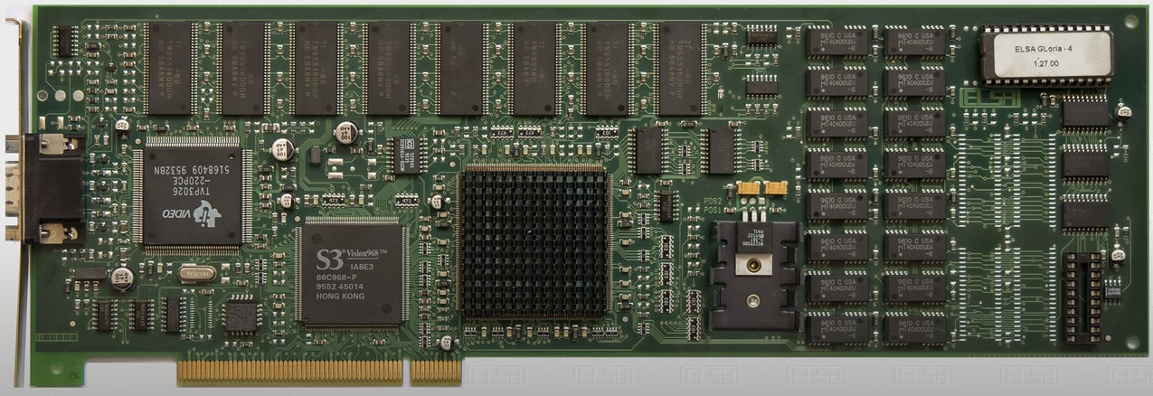 This was used on the ELSA GLoria (see image above) and Diamond FireGL with capabilities including Gouraud shading, flat shading, anti-aliasing, stencilling, fogging, alpha blending, clipping, texture mapping and more. The ELSA card also comprised S3's Vision968 for 2D graphics acceleration, 4 MB or 8 MB of video memory, and built-in compatibility with DirectDraw and OpenGL. |