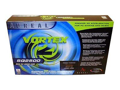 The Aureal Vortex 2 SQ2500 was Aureal's own sound card. Up until this point they had not ventured into the world of producing their own sound card, having worked exclusively on selling their 3D audio chip separately to actual sound card manufacturers. The SQ2500 added an S/PDIF RCA jack to the faceplate which was fairly rare on Vortex 2-equipped cards (some have a TOSLink digital out instead), as well as a Wave Blaster-compatible wavetable header. The card was also bundled with games titles Drakan:Order of the Flame (Psygnosis), Heretic II (Raven Software), and a demo of Slave Zero (Accolade).