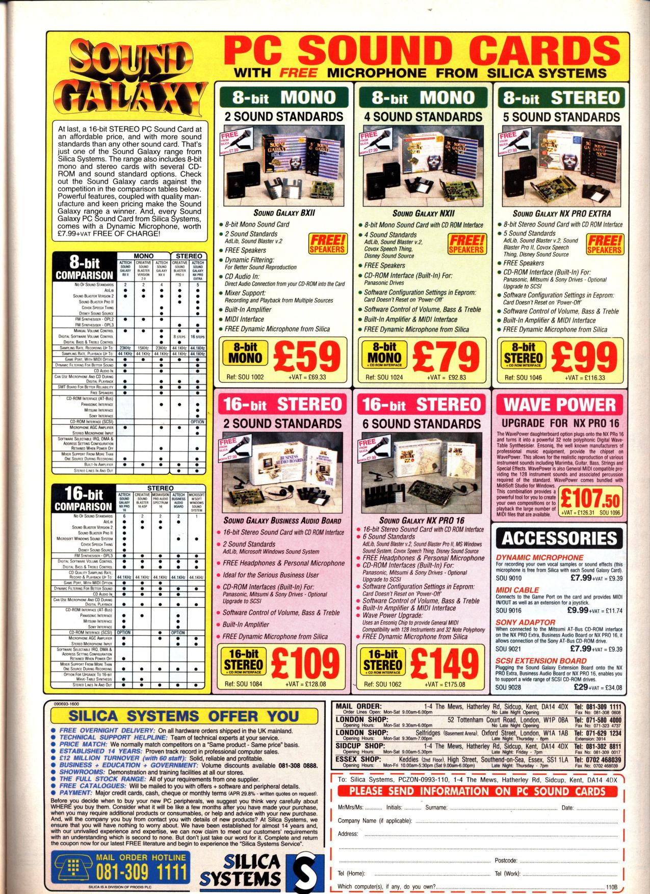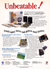 "The most striking thing about the Sound Galaxy NX is that its manufacturer, Aztech Systems, claims that it emulates just about every other popular low-cost card on the market. The systems it mimics are Ad Lib, Sound Blaster, Covox Speech Thing, and Disney Sound Source. That's an impressive line-up as far as the dedicated games player is concerned because it amounts to this particular card being supported by just about every PC game released in the last couple of years. Performance wise, this board produced good, clear sounds in all of its modes, although I did occasionally notice some interference, especially at high volumes." PC Review, November 1992