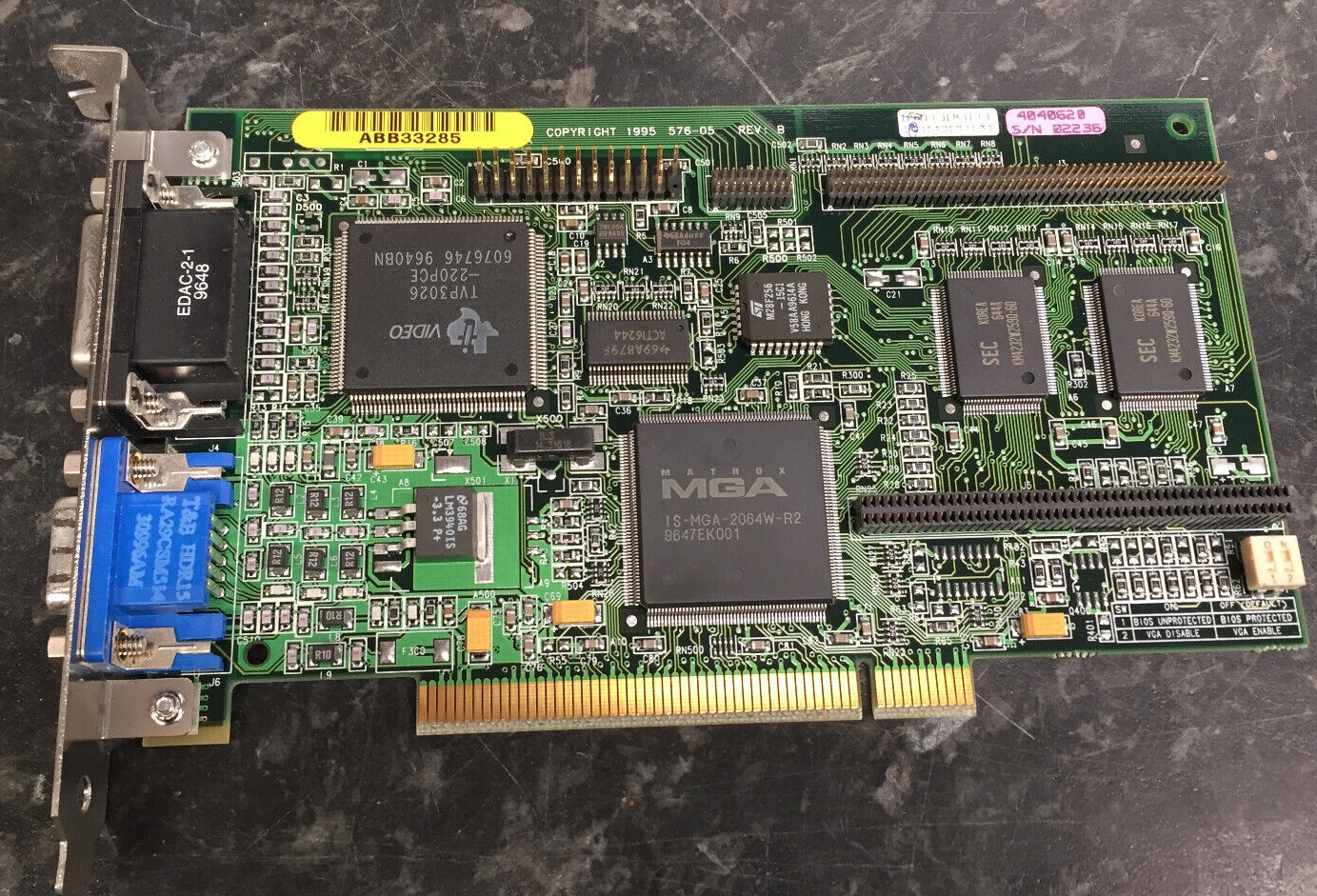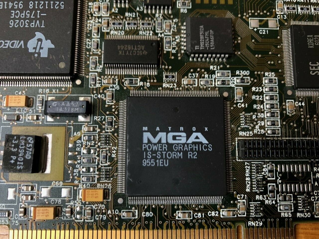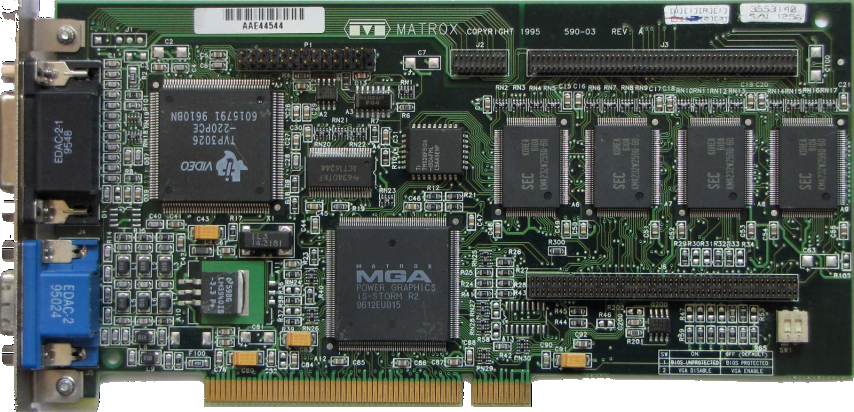 The MGA Millennium went through a number of different revisions from 1995 to 1997. Given the many varieties of Matrox cards used the Millennium moniker, it can be a little bit confusing. All MGA Millennium cards had chipsets and model numbers with "MGA-MIL/" or "2064" on them. If you see a card with other codes, these are other Matrox models (1064=Mystique, 1164=Mystique 220, MIL2/ or 2164=Millennium II, etc). Likewise, anything with a G-code like G+, G2+, G200, etc, are also different [and later] models. Millennium IIs are easy to spot in pictures as they have thicker memory expansion sockets.