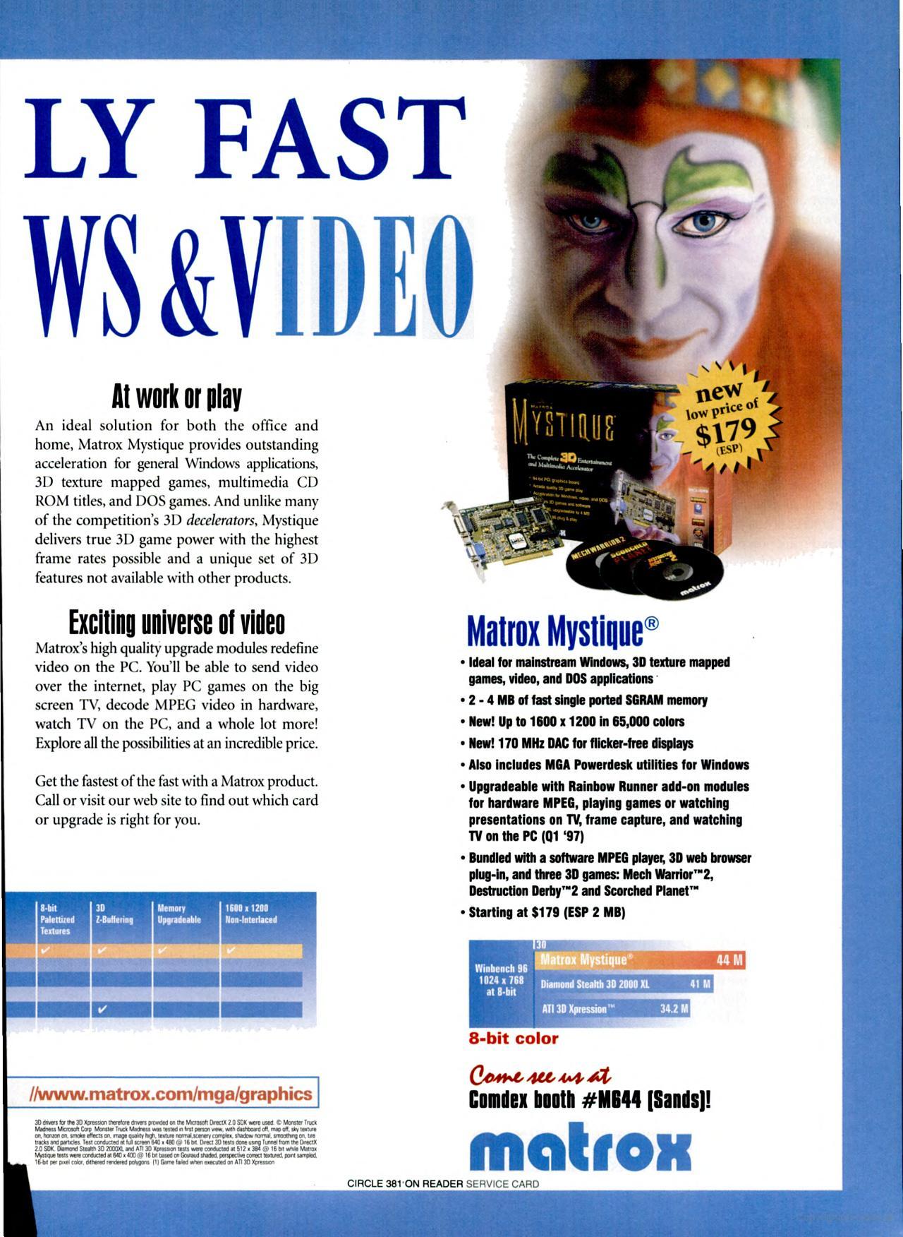 Matrox says it sacrificed some effects for a higher frame rate, which might be an acceptable trade-off for fast-paced game action. Indeed, on our 3-D tests, the Mystique spits out Direct3D frames faster than most of its competitors. The subjective game-playing experience - taking into account frame rate - place the Mystique second only to Intergraph's Reactor in this roundup."