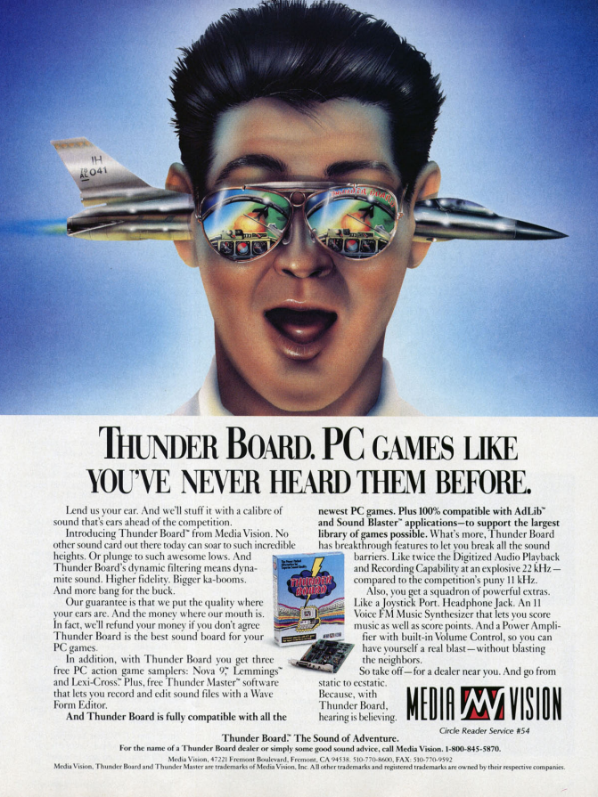 "If one is not into all the extra software that comes with the Soundblaster, MediaVision's Thunderboard is a lower-priced alternative, complete with optional MIDI interface, and claims 100% compatibility with products written for both the Ad Lib standard and the Soundblaster standard. It comes bundled with demos of three front-line software programs."