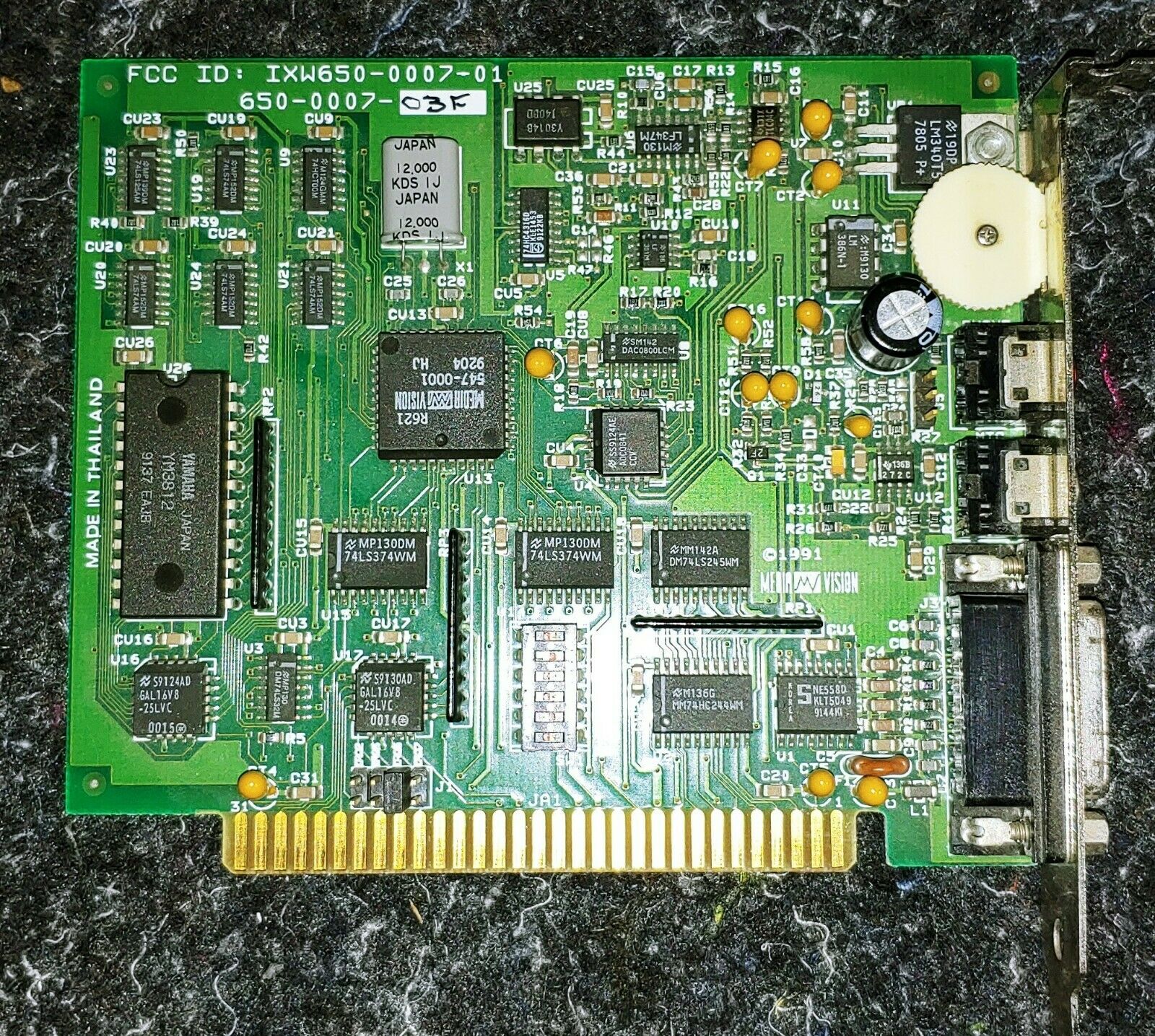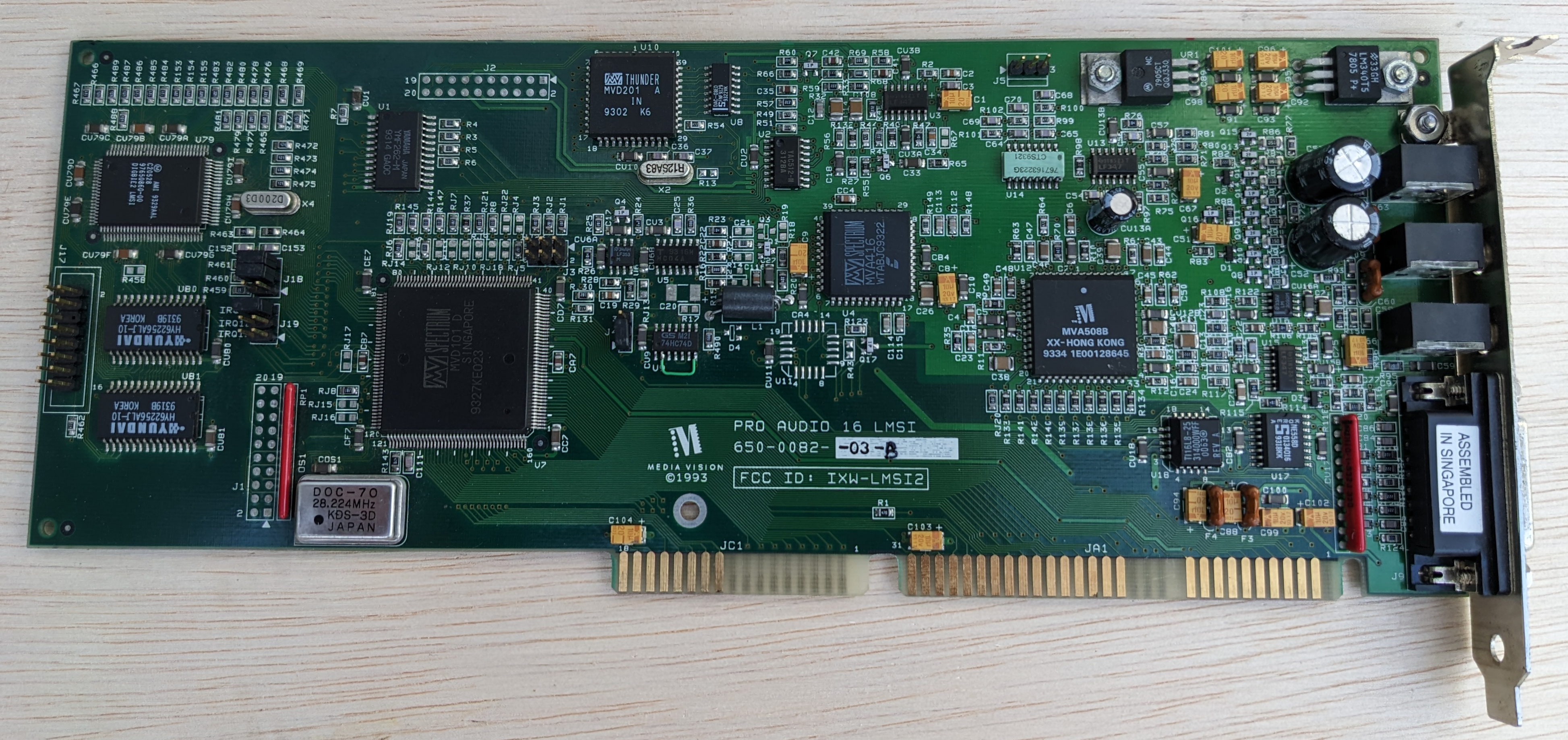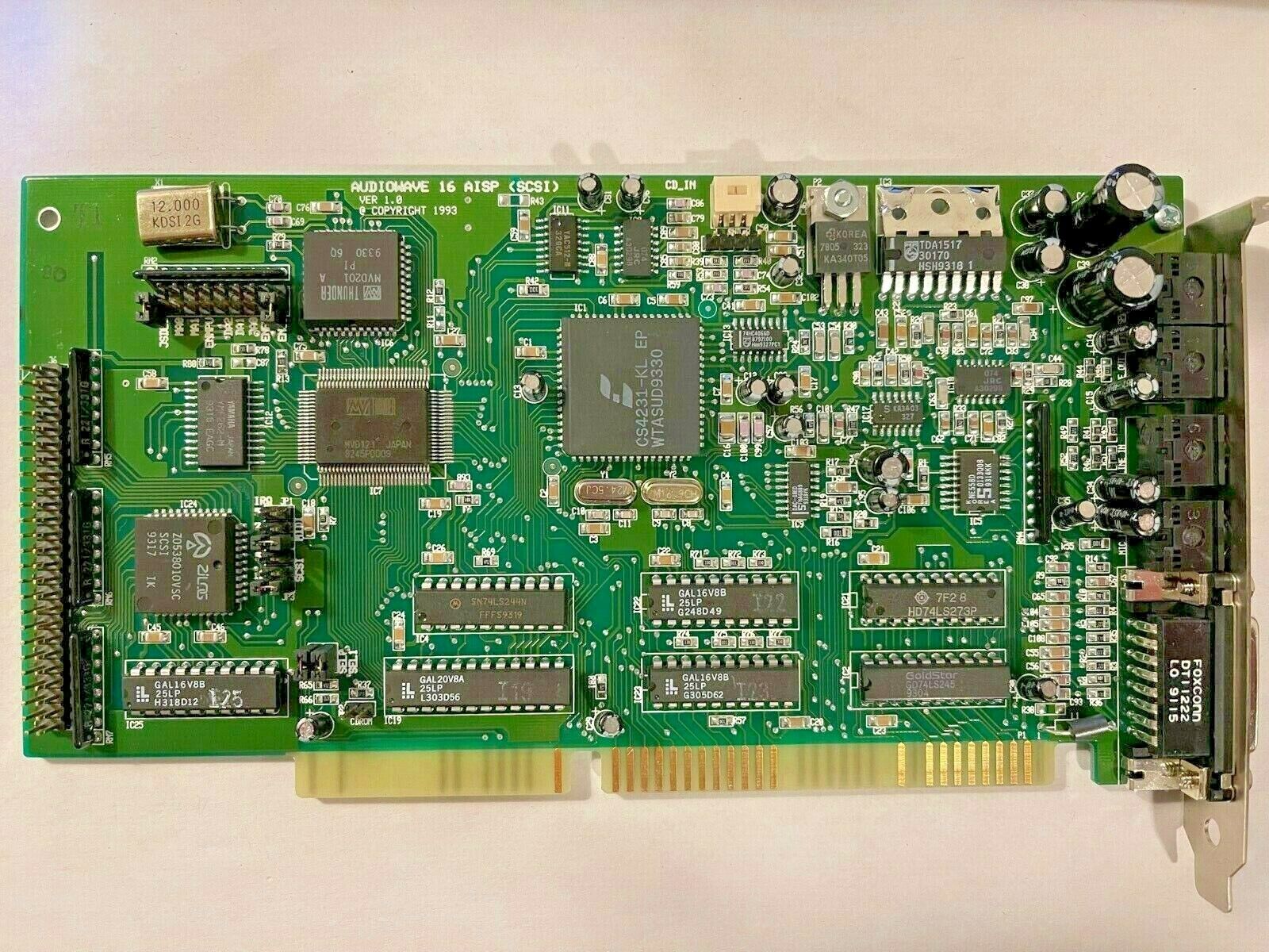 There was also a more enhanced card, the 16-bit ISA Multiwave Innovation Audiowave 16 AISP (SCSI) (FCC ID: KLZ1005I), which had the Thunder Board chip, but also had a Crystal CS4231-KL, Media Vision MVD121 chip (possibly a later version of the chip used on the Jazz16 MVD1216?), and a real Yamaha YMF262, plus a SCSI port. This card supports Ad Lib, Sound Blaster, Thunder Board, Sound Blaster Pro and Windows Sound System.