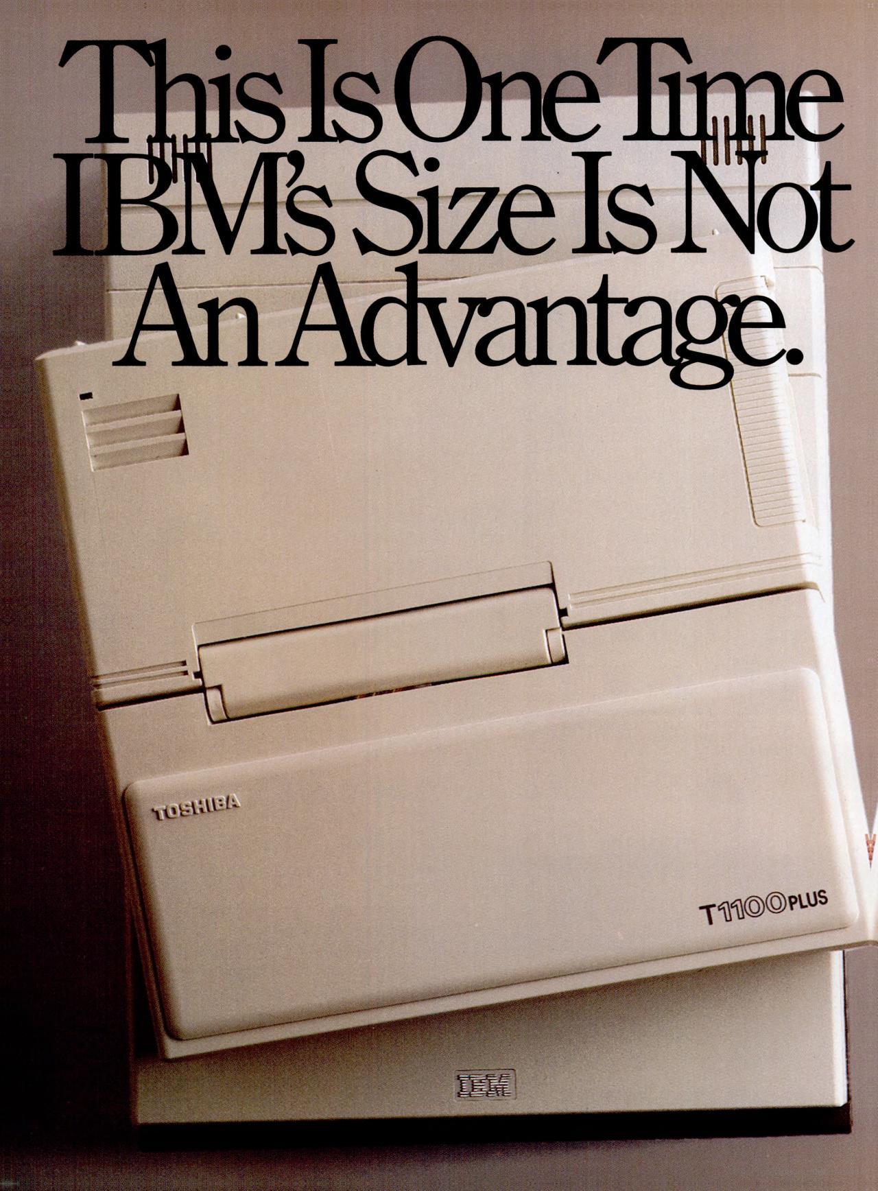 shows up in the sculpted lines of its plastic shell and its logical keyboard layout. It travels well across town or across the country. Wait no longer if you need a computer that goes where you go: the Toshiba T1100 Plus is it." PC Magazine, January 1987