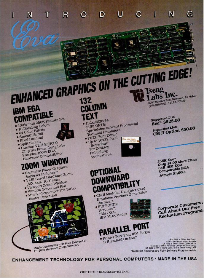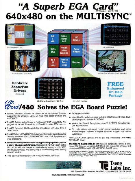 "As we mentioned above, the Tseng EVA/480 is repackaged and sold by NEC as the GB-1. Both come bundled with Media Cybernetics' Dr. Halo II. With both boards, a daughterboard provides compatibility with CGA and Hercules.