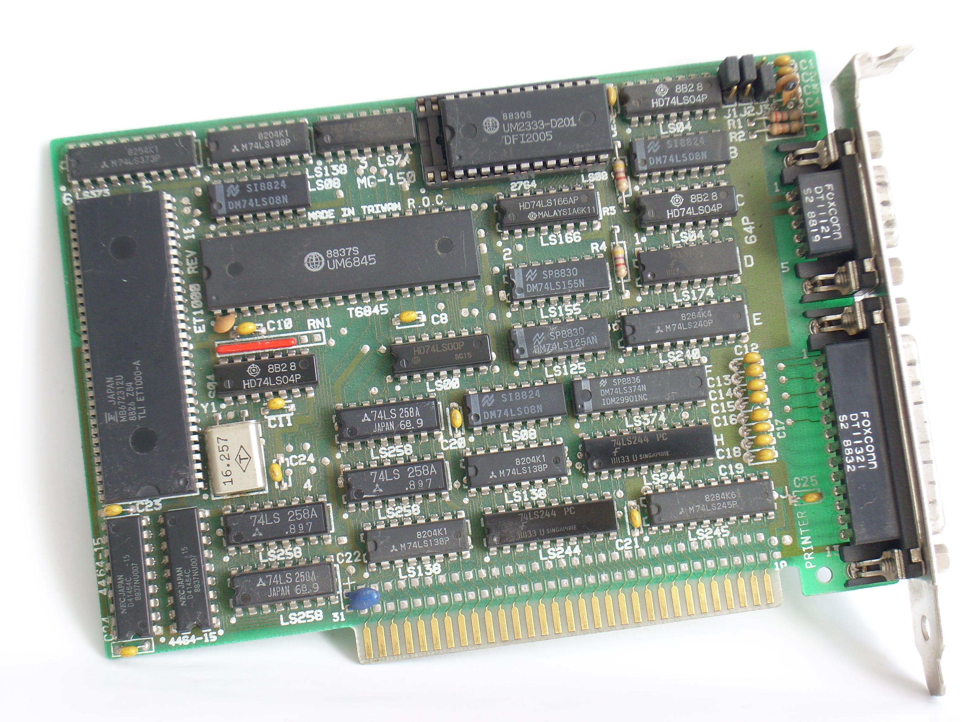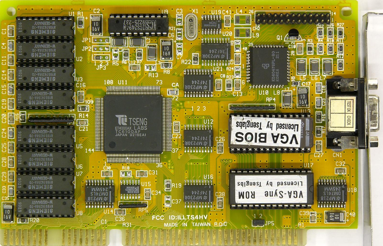Tseng Labs' ET1000 was an EGA-compatible card with 64 KB video RAM. It had both TTL output (9-pin D-SUB), and an LPT (printer) port.