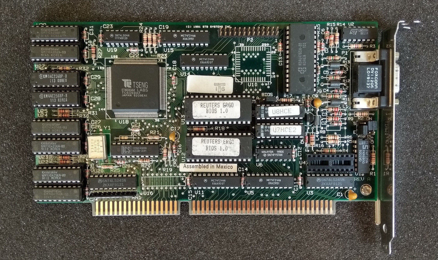 The accompanying RAMDAC on ET3000 cards was typically a flavour of the 82C176, manufactured by various IC fabricators including Suntac (GST GSO276P), Inmos (IMS G171P), and Siemens (SAB82C176). Compatible chips were also used from Analog Devices (ADV476KN) and Brooktree (BT471KP/BT476KP). RAMDAC speeds vary from 40ns up to 60ns, but all fully support display of up to 256 colours from a palette of 262,144 colours in 800 x 600 or 16 colours at 1024 x 768.