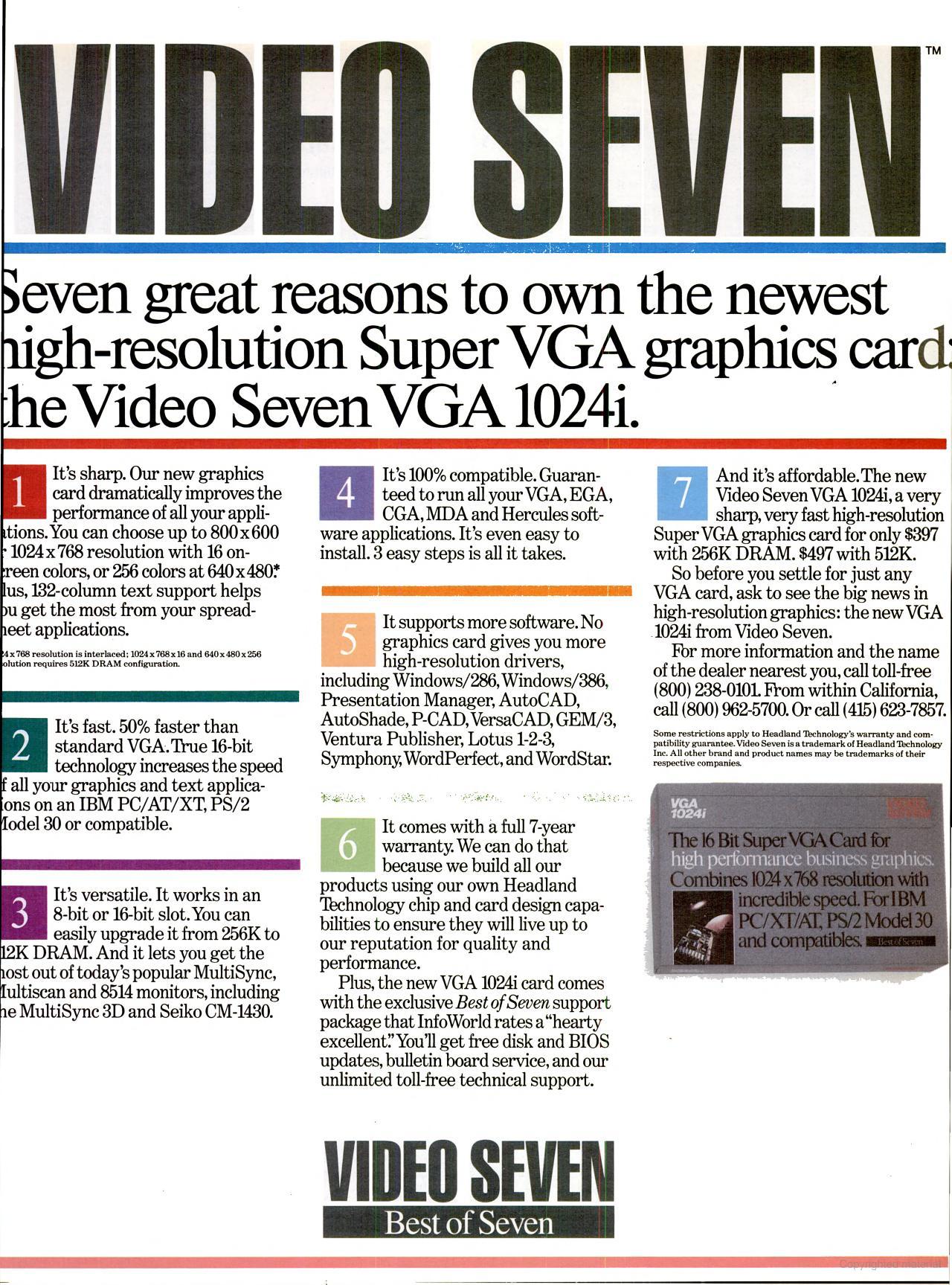 A review of Video Seven was conducted by PC Magazine in September 1990, where they mentioned "The VGA 1024i board is given good ratings by respondents who own them, with 79 percent rating it very reliable and only 12 percent reporting problems. In fact, several 1024i respondents have taken the trouble to comment on the survey how much they like it.".