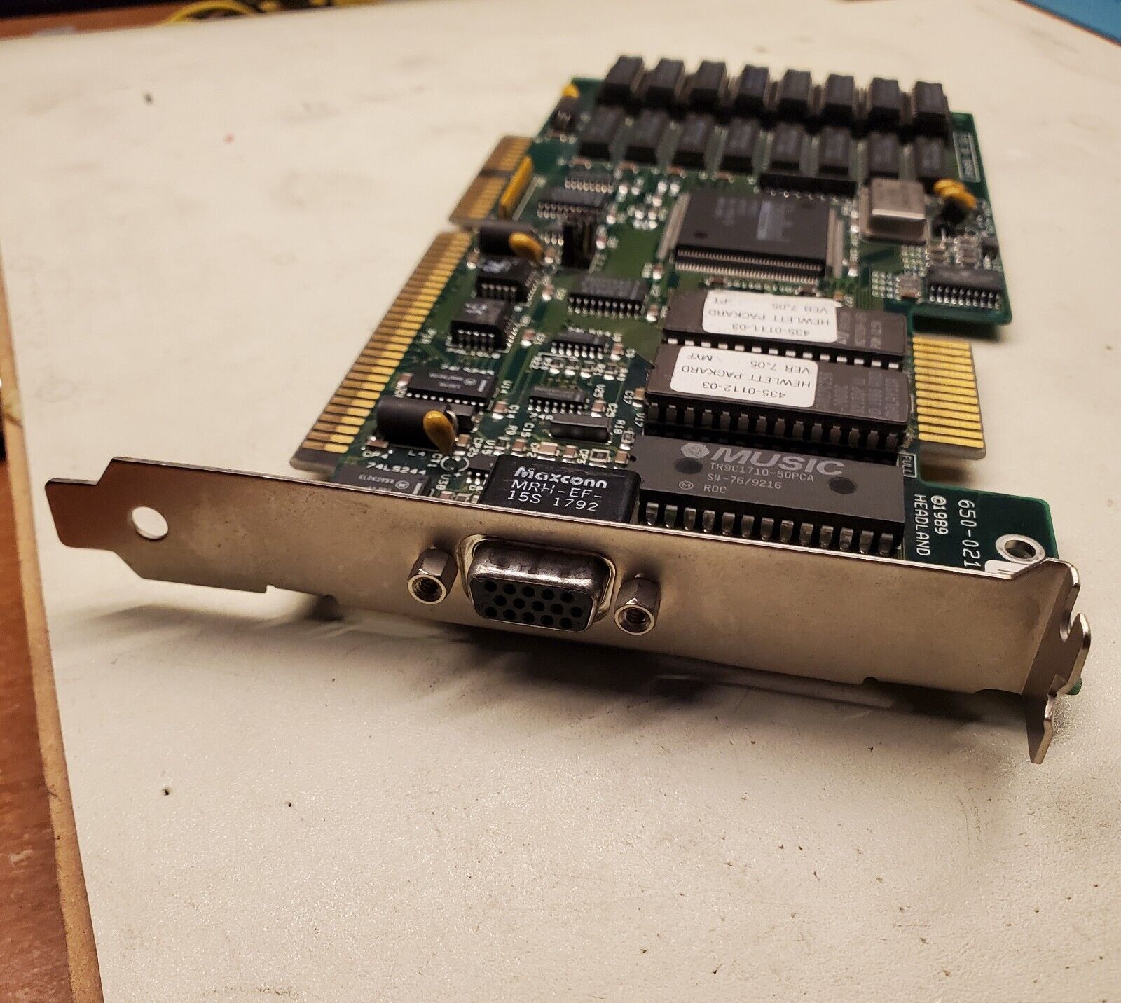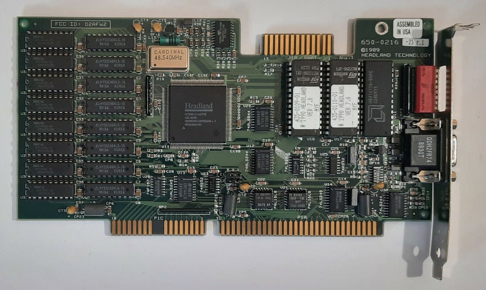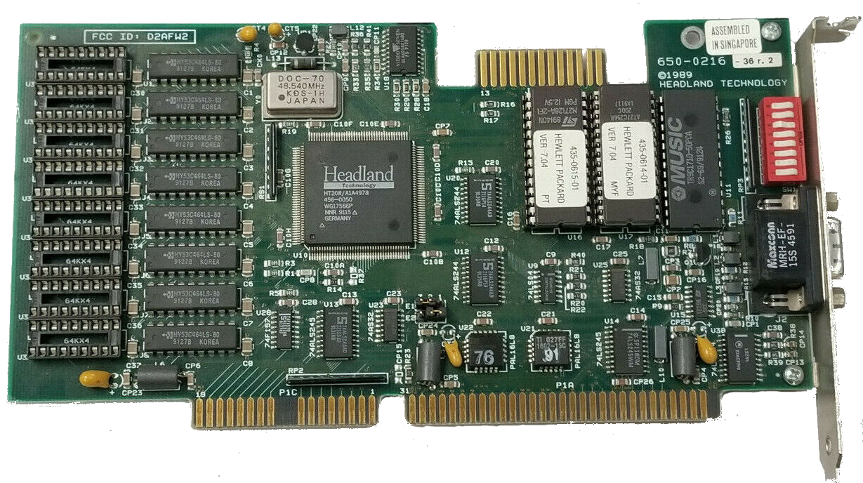 Part #: 650-0216-23 r.1 Main Chip: Headland HT208 dated Week 34, 1990 RAM: 512 KB (256 KB of Samsung KM41C464 (100ns) in bank 0 and 256 KB of Mosel Vitelic V53C464AP (70ns) in bank 1) DAC: AMD Am81C176 50 MHz BIOS Chips: v7.0 AMD Am27C128 (16 KB) v7.0 National Semiconductor NMC27C256 (32 KB) |