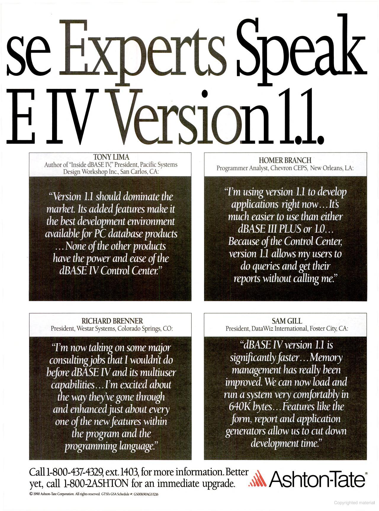 Dbase IV was such an improvement over DBase III Plus that its introduction was met mostly with enthusiasm. The Control Center was actually easy to use - a Dbase first. The query-by-example module that Paradox made so popular on the PC was a welcome move. Dbase IV introduced a more versatile screen and reports designer, and replaced an obscure utility with a real applications generator. The production index file was perhaps least visible but very significant. It was the first step taken by Ashton-Tate to eliminate the need for continual reindexing as a characteristic of Dbase applications.
