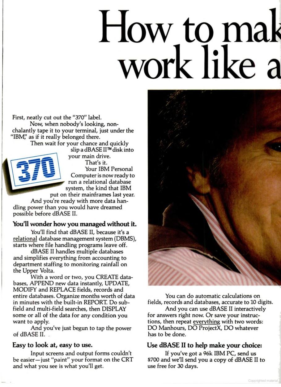 Two advertisements of dBASE III Plus, April 1987 (left) and November 1987 (right)