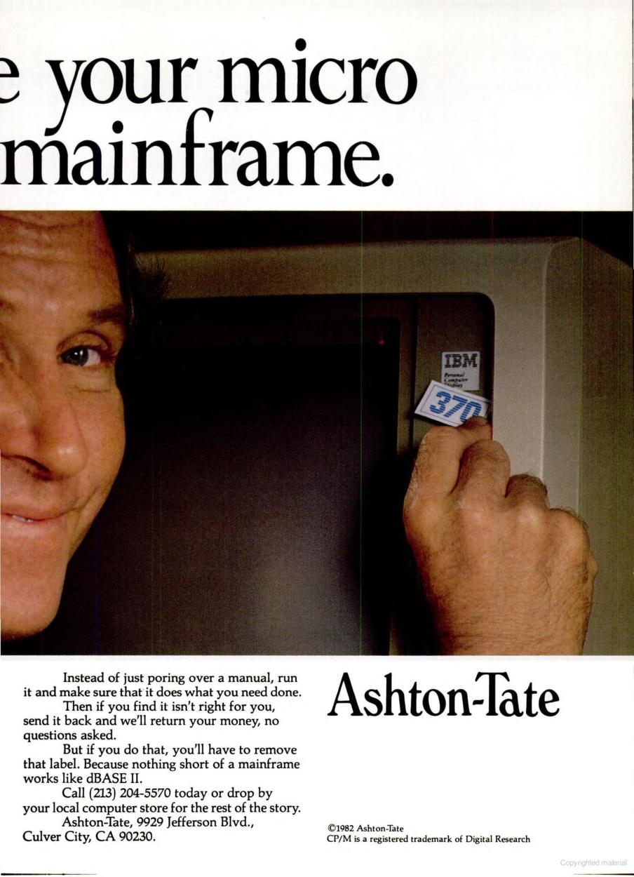 George Tate and Hal Lashlee had formed two successful software distribution companies, Discount Software and Software Distributors. In 1980 they entered into an agreement with Ratfliff to market his Vulcan database product, and formed a new company, Ashton-Tate, to do it, and rebranded Vulcan as dBASE II. It was the same version as Vulcan, but for marketing purposes they added the 'II' as it sounded like it was less-buggy than a first-release product. It was regarded as one of the killer applications for CP/M that achieved great success, as license prices were around $700 per installation for dBASE II. At the time of conception Ashton-Tate had been a garage based company but quickly grew into one of the 'big three' software companies, alongside Lotus Development and WordPerfect.