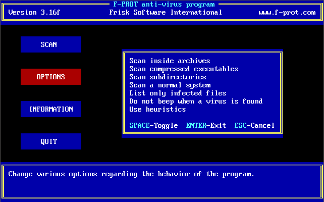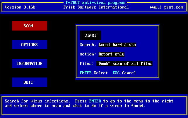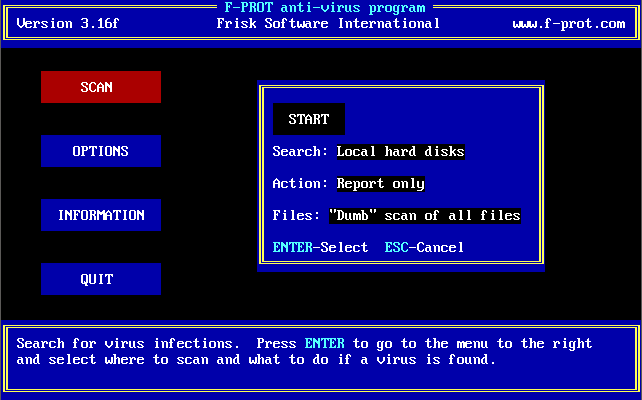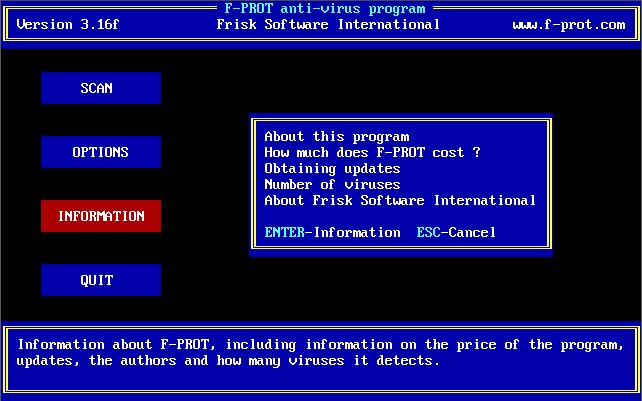 Version 3.16f of F-PROT anti-virus software for DOS is a complete monitor, scanner and disinfectant. This version has the latest definitions up to 8th January 2009 with over 311,000 virus definitions stored. It definitely wins the 'numbers game' claiming it can detect over 434,376 DOS/Windows viruses and 158,607 trojans, 44,232 scripting language viruses, 8,755 Word/Excel macro viruses, 698 Java viruses, 5,246 BAT viruses, 3,334 IRC INI file viruses, 605 IS INF file viruses, 687 UNIX shell script viruses, 248 PHP viruses, 620 UNIX file viruses, and over 15,750 others through generic means.