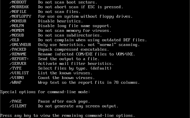 It can scan within archives (ARJ / CAB / LZH / RAR / ZIP), many packed executables and emails. Running it today requires the use of the /OLD command-line argument to ignore the fact that all .DEF (virus definition) files are out of date.