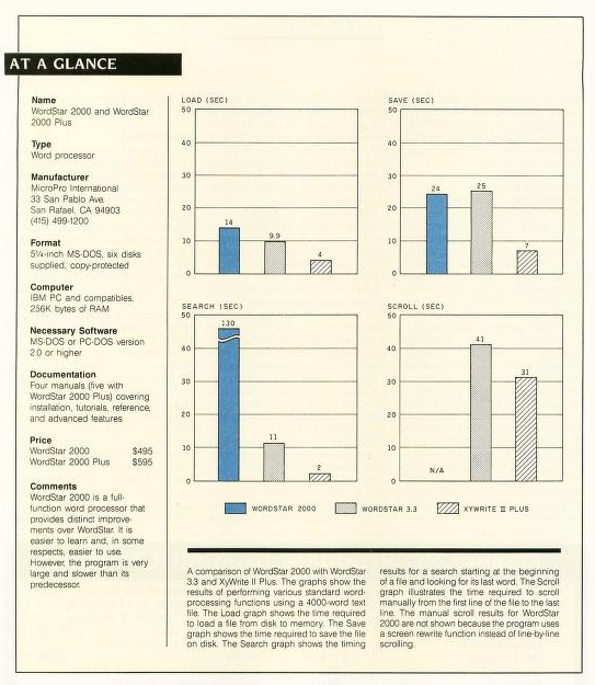 There is not much that WordStar 2000 cannot do well. The problem is that it will do it slowly and sometimes with more intervention from prompts and confirmations than 1 would like. WordStar 2000 is written in C, which lets MicroPro transport it easily to other machines, but this results in slower program execution.