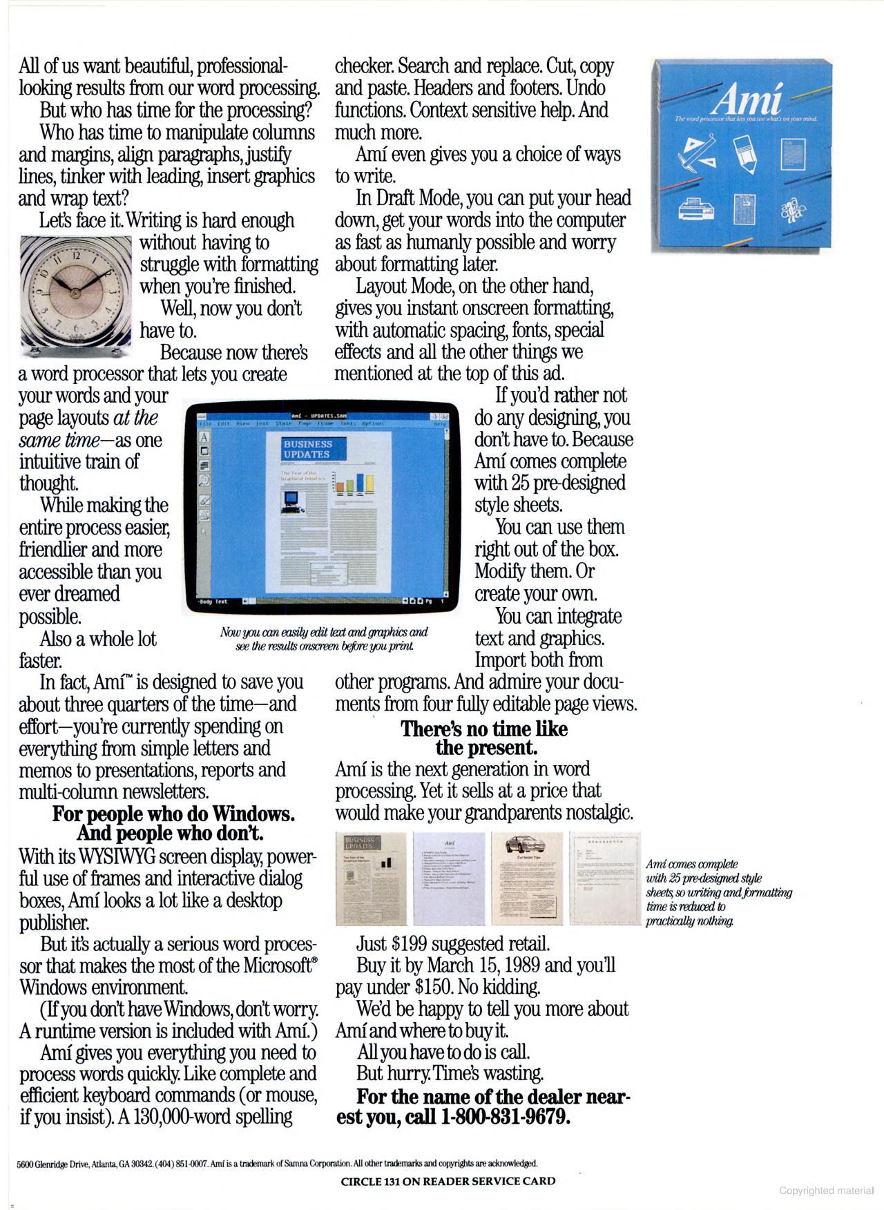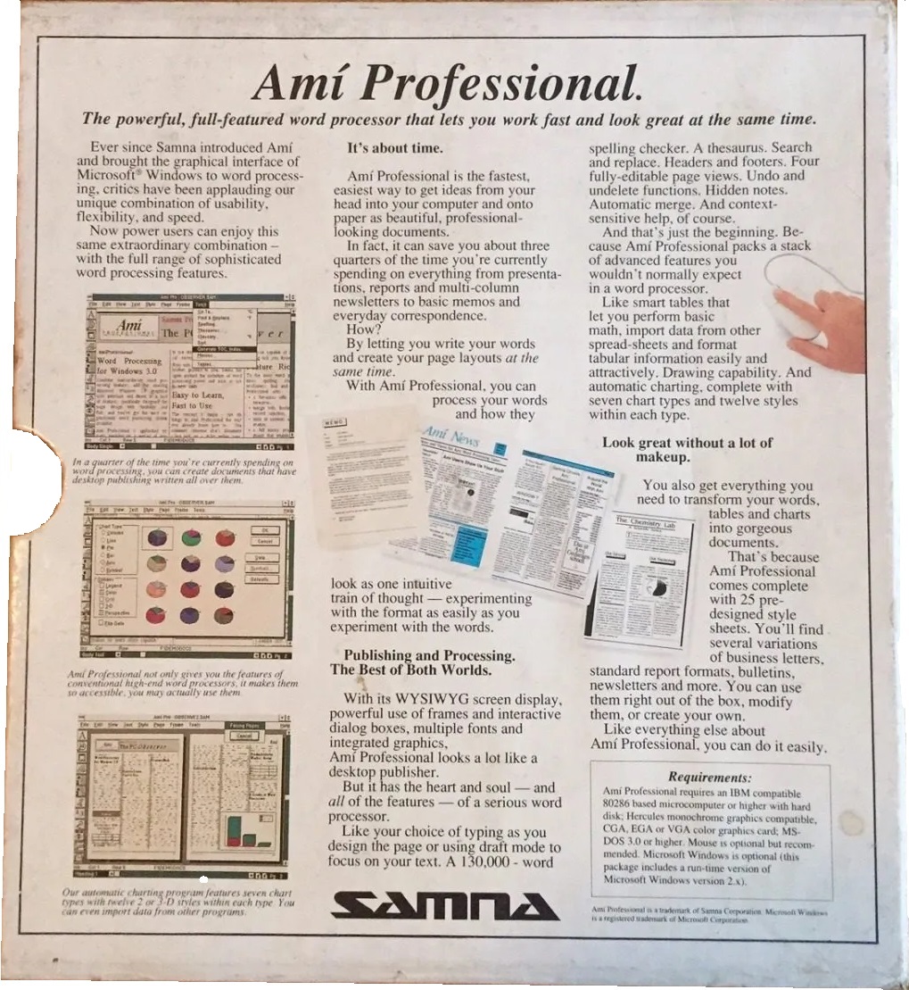 In 1988, Samna produced the first commercial Word processor for Windows [2.0], beating Microsoft by about a year before the launch of the first version of Word. Its feature-rich word processor was simply called "Ami". It later became Ami Pro after they added support for tables, competing directly against WordStar and MultiMate.