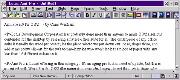 From the beginning, Ami and Ami Pro were never staid. It always had the jazziest interface of any word processor. With its row of icons down the side of the screen, the original product could easily be mistaken for a paint program. And from the first, it seemed to be infringing on desktop publishing with its power in mixing images and words. It tended to lack some of the power of Word for Windows, but made up for it with the ease with which users could access its features. Perhaps because it looked more fun, it lagged behind Microsoft's product in sales, even with the help of Lotus's marketing muscle.