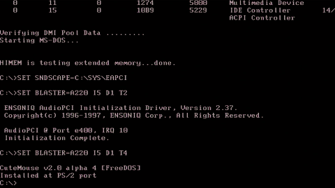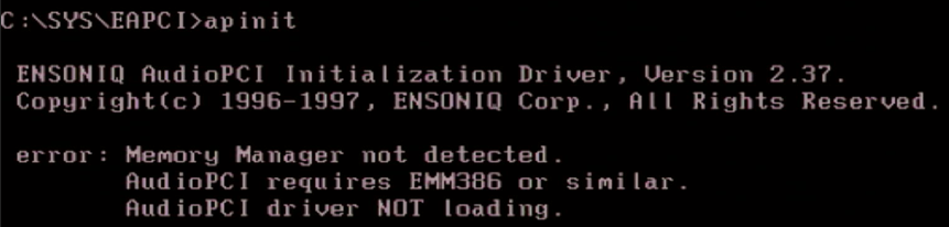 HINT: The AudioPCI driver, APINIT, requires an Expanded Memory Manager (EMS) to be loaded, such as EMM386.EXE. If you have games that only work with XMS, be sure to load this with the 'NOEMS' argument, so the driver will still load for AudioPCI to work, but you will have XMS memory available.