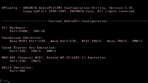 In reality the Sound Blaster emulation in DOS is not 100%, and numerous games will simply not detect the card. MIDI quality is good - the AudioPCI card does not have its own built-in patchset, instead relying on Ensoniq's software patchsets (called wavesets) that would be loaded into RAM - they made 2 MB, 4 MB and 8 MB patchsets. The 4 MB and 8 MB patchsets also supported the Roland GS standard.