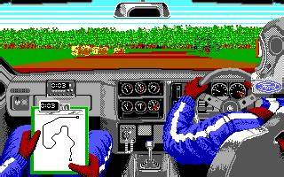 In this game, Mandarin Software did a decent job of capturing the spirit of the rally championship. Not only can you be the driver, you can change some settings of your car in the workshop, and you can earn money by taking part in a TV interview. The various rally stages are available to drive, with road, mountain and forest legs. The view is from just behind the navigator and driver - for the navigator, rather than hearing or seeing voice annotations like 'four right', or 'five left, don't cut', you simply see a map of the route and how far you've got to on a clipboard in the navigator's hands. On the right sits the driver whose hands move with the steering input and he changes gear when you do - a nice touch. The speedometer and rev counter also move according to your speed and engine revs, as you would expect. The only other item that changes in the vehicle are the two clocks - the top one provides your total time so far across the whole rally stage, and the lower one on the clipboard gives you the elapsed time for the current leg.