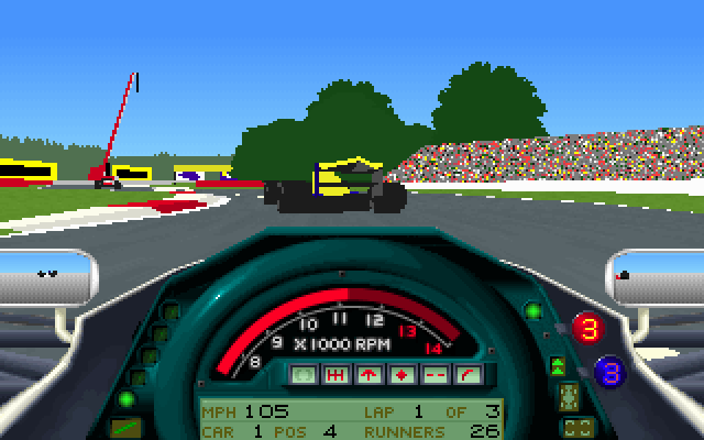 Sound: Good intro music that's similar to the old BBC F1 intro theme, amazing engine sounds - all you would need, unless menu music is important to you, of which there is none. You have the option of Ad Lib, Sound Blaster and Roland MT-32. 9/10