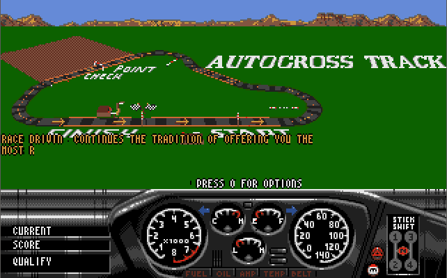 Developed by Distinctive Software and released in 1991, it differed from previous racing games in that it has a career mode that tracks Mario Andretti's racing career through six series, from sprint cars right through to Formula One and Indycar. Featuring 12 tracks, you race in just 1 car of each series. With sponsorship seed money to start you off, you must progress through up to three levels in each series, starting off with a Heat, followed by either a Consolation race if you finished behind the top 3 or the Feature race if you did. The better you do in each race, the more money you get.