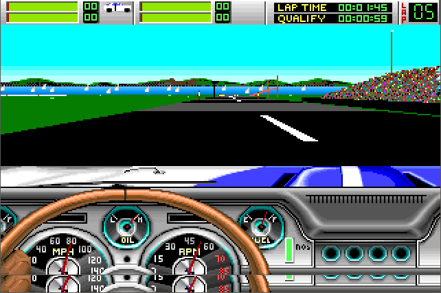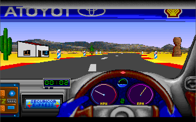 The game has a good frame rate but sadly the 'feel' of driving the car is far too simplistic and arcade-like. The car has no sense of weight to it, and the driving physics are incredibly basic. This detracts from what could otherwise be a fun driving game. The VGA graphics aren't used to the full, looking much closer to 16-colour EGA apart from a few telltales like the gradiated sky and distant landscape. You do have the freedom to go 'off-piste' but really it's a track-based racer, and your car doesn't drive well off the black stuff.