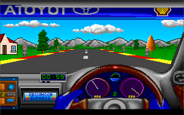 On top of its lovely scenery (which it could run in 256-colour VGA at 320 x 200 resolution), the game provided both day and night driving, weather effects including rain and snow, working headlights that shone out from the front of cars, windscreen wipers, actual digitised dashboards for all driveable cars, a graduating sky and nice shading on 3D models that gave them depth.