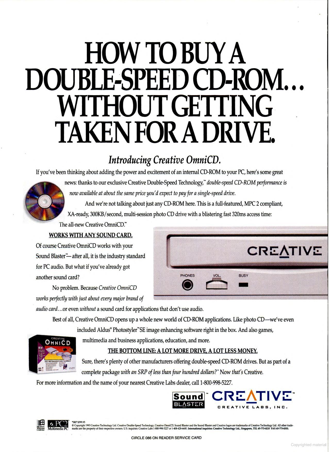 Creative Labs were quick to see the potential of the new technology in the PC market, and responded by including a CD-ROM interface on their new Sound Blaster Pro audio card. They also started bundling CD-ROM drives with their sound cards. These 'multimedia upgrade kits' were an economical way to upgrade your computer to meet the new multimedia craze.
