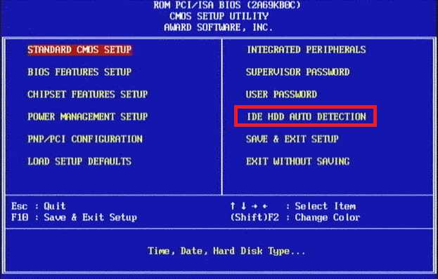 Step 3) Many modern BIOS have a Hard Disk Auto-Detect feature - choose this if available. In the AMI "WinBIOS" it's under the Utility section and is called either "Detect C" (1993 version) or "IDE Setup" (1994 version).