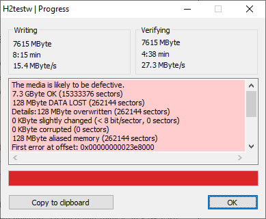 To test my cards, I initially formatted them using the SD Card Formatter, then used H2TestW v1.3 which performs a data write to the entire card followed by and verify of that same data. This tool also tells you how fast the data write and read is. With my 8 GB Kingston 133x card is showed a write speed of 15.4 Mbyte/sec, and a Verifying (read) speed of 27.3 MByte/sec. a 133x card means it has a theoretical maximum transfer speed of 133 x 150 KB per second, which is 19,950 KB/sec, or 19.48 MB/sec. This is the manufacturer's speed rating - the reality could be higher or lower depending on a number of factors.