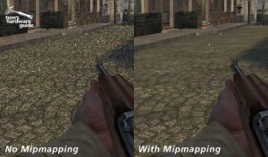To enhance processing speeds, developers will use several different detail levels for each texture. For instance, when you approach a wall in Unreal, at the furthermost point the texture will be a very low-resolution image. As you get closer to the wall the computer then calls up a higher-resolution texture and merges the two. This keeps objects from looking pixelated up-close - remember Doom? Trilinear mip mapping is the use of three of these textures (a far, medium and near texture) so you will notice a smooth transition of a texture as you approach from a distance.