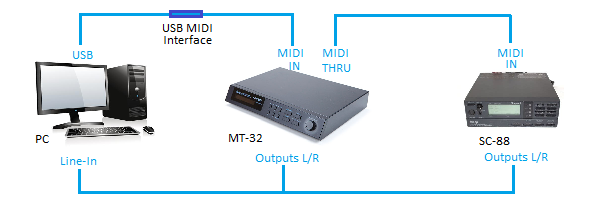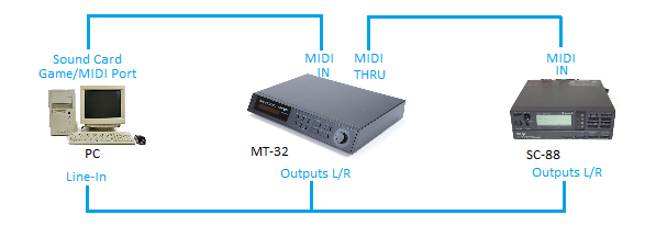 The game being played sends MIDI messages from the PC, out of the USB port to the USB MIDI Interface. This is received by the Roland MT-32 via its MIDI IN socket. The MT-32 sends its audio signal back to the PC's Line-In port, so if you're playing an MT-32 game, this will work. In addition, the same MIDI messages received by the MT-32 are also sent out of its MIDI THRU socket to the Roland SC-88's MIDI IN socket. The output jacks of the SC-88 are also connected to the PC's Line-In (using a 3.5mm jack socket splitter cable or adapter)