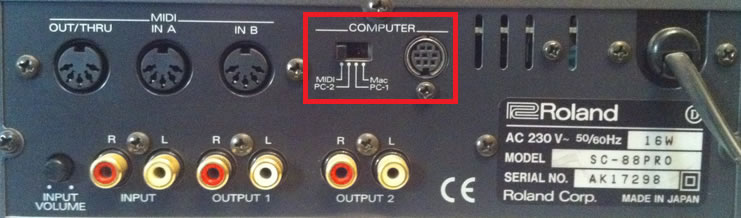 3) If you have a Roland SC-series, or Yamaha MU-series, with the MIDI device still switched off set the MIDI/PC-1/PC-2/MAC switch on the back to "MIDI":