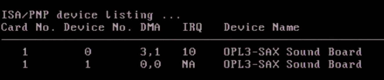 When your machine boots up, if you have an ISA Plug & Play BIOS, you may see the card being detected and assigned IRQs and DMA channels like this: