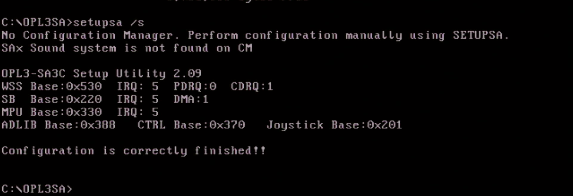 According to the readme, the Configuration Manager (CM) it refers to is the Intel Config Manager. It says: if it is installed on your PC or if your PC has a PnP BIOS that supports the sound card, SETUPSA will only read the settings assigned by CM and will only reset the sound card, not initialise it using the settings stored in OPL3SA.INI. In this case, only the volume can be changed in the dialogue mentioned above. (Unable to perform I/O, IRQ, and DMA settings.)