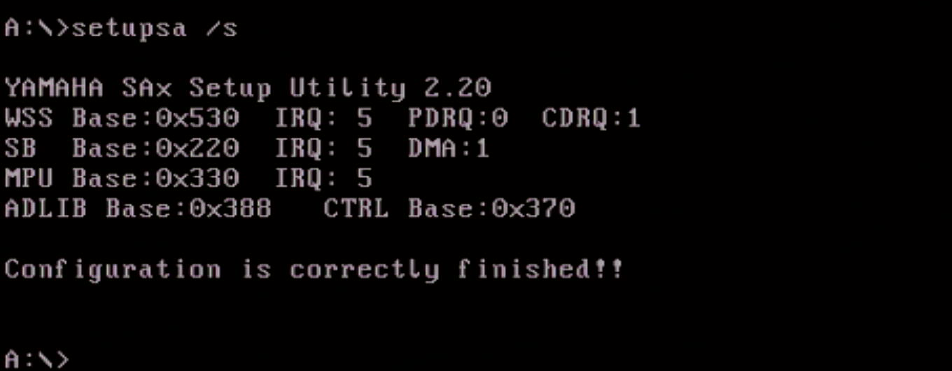 For DOS, the software configuration is done through a utility called SETUPSA.EXE (usually found in a 'DOS' subdirectory on the driver CD). There are several versions of the DOS driver for the YMF7xx range (these differ from the version of the INSTALL.EXE so don't be confused about the version of SETUPSA you're using), and not all of them work fully(!). Here's a summary of versions that I found, along with links to download them: