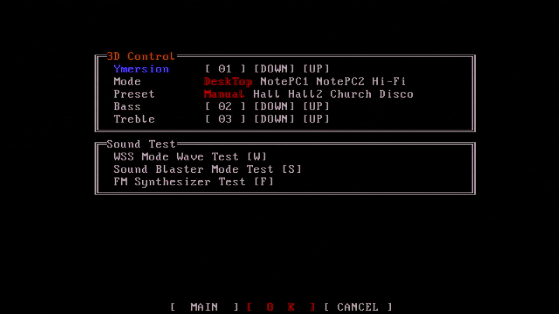 It's not the best config utility around, and is a bit of a pain to navigate around. You use Tab and Shift-Tab to move up and down between the options, and Left and Right to change the setting. The 3D control/testing screen is accessed right at the bottom by hitting <Enter> when the [ 3 D ] option is highlighted.