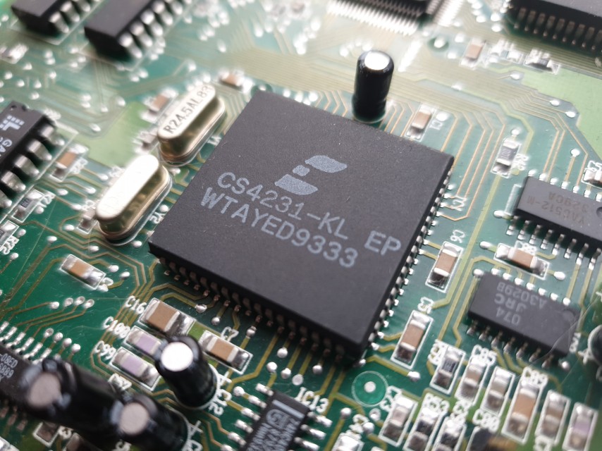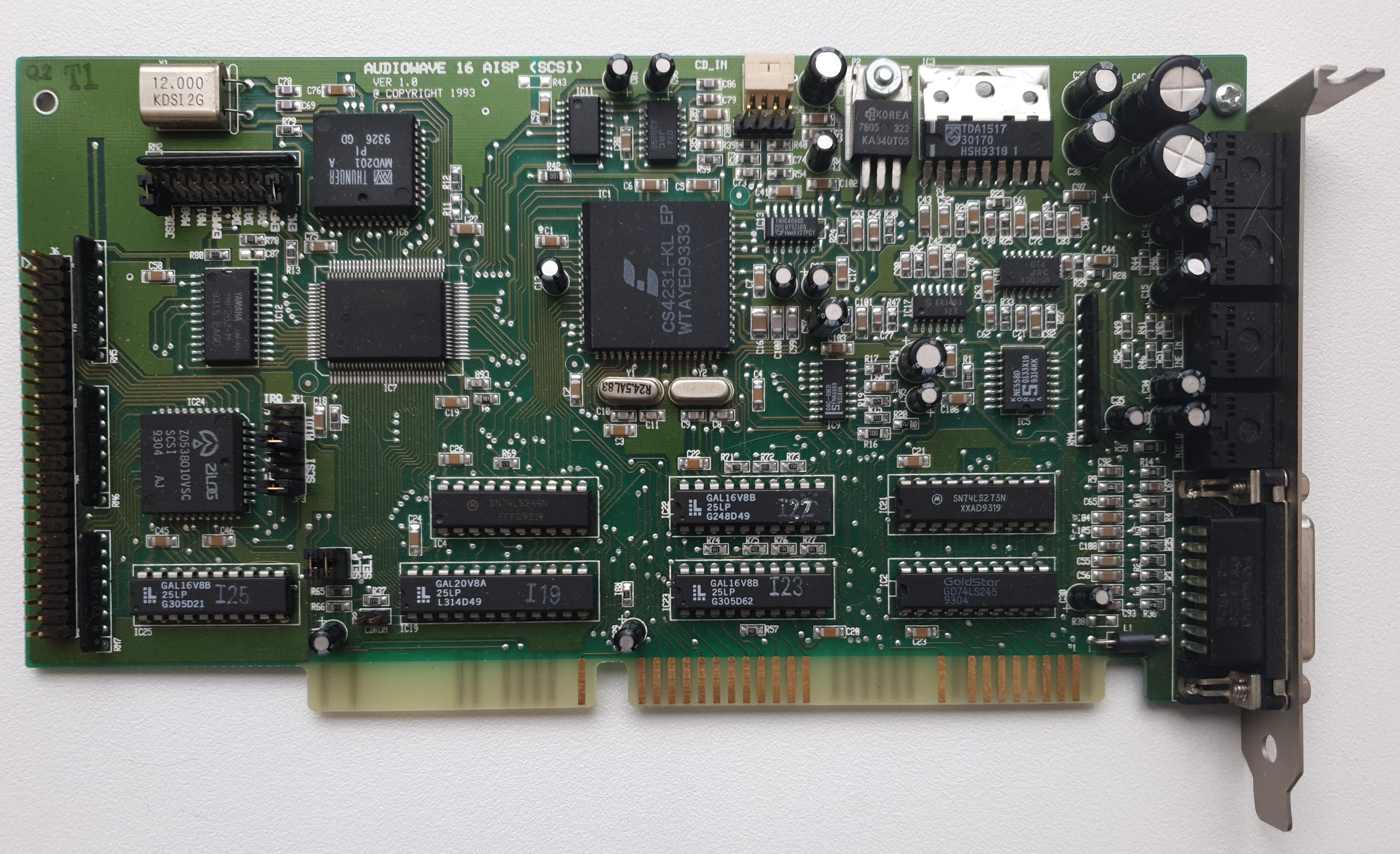 The heart of this sound card is the Crystal CS4231KL - a 16-bit audio codec whose role is to handle the analogue audio to digital signal compression/decompression, audio filtering and mixing. It had a number of enhancements over its predecessor, the CS4248 (aka AD1848), including up to five analogue inputs over CS4248's three, mixer attenuation control on line input, MPC Level 2-compliant mixing, ADPCM and Big Endian audio format support, full duplex DMA, and independent selection of capture and playback audio data formats.