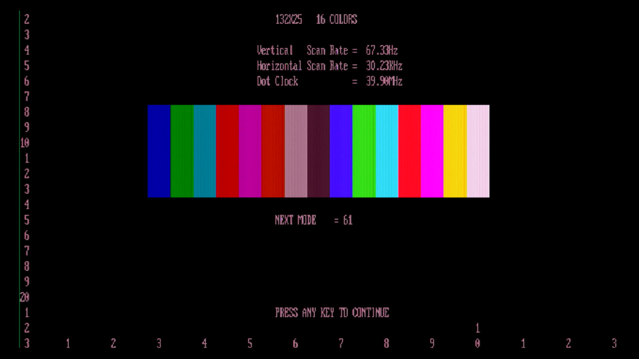 - Mode 0+ (16-color VGA 9x16 character block, 8 display pages)