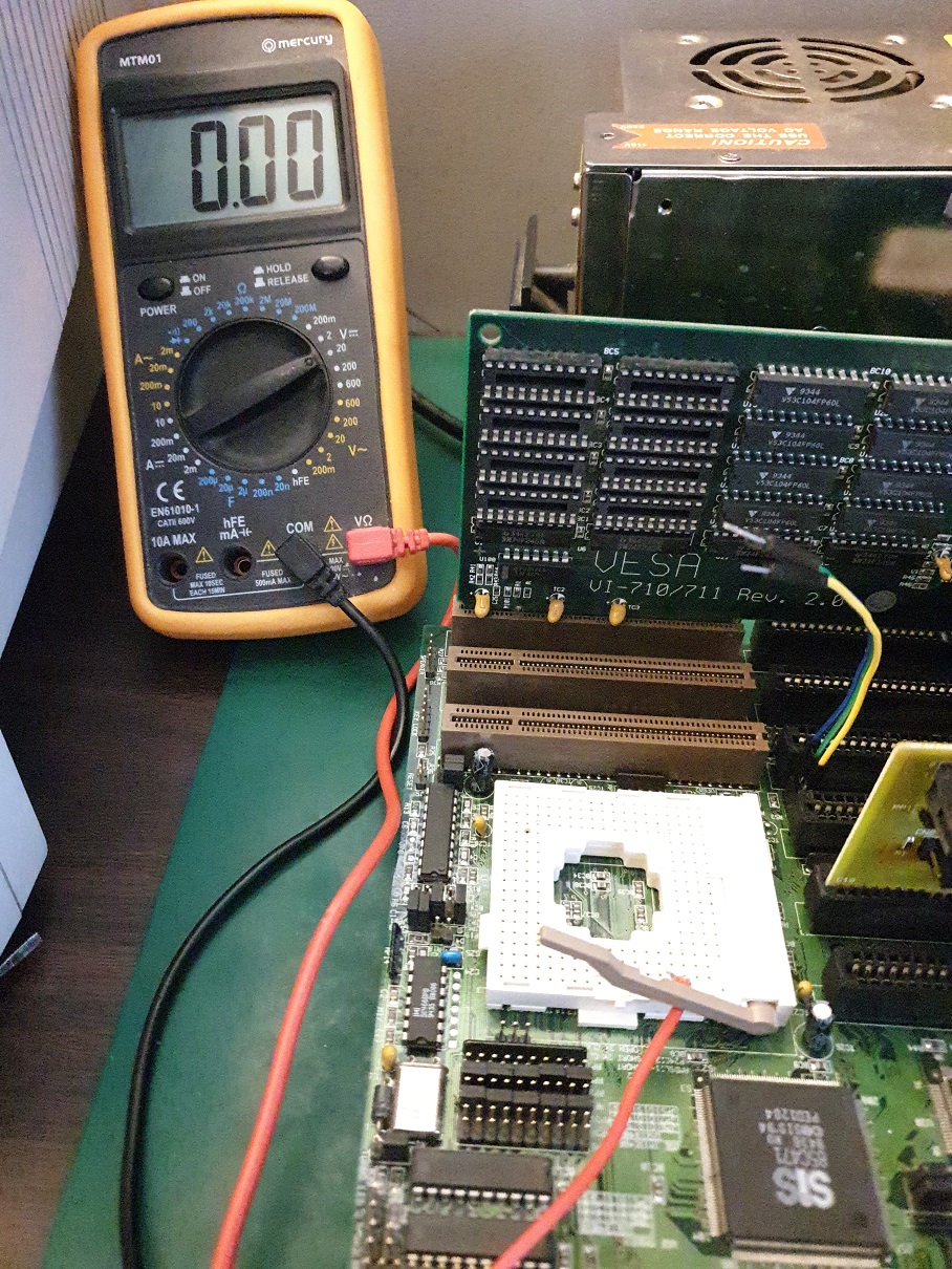 Step 1 is to identify what each of those 3 pins on the board actually does. To do so, I will use some wires and my multimeter to check the voltage levels at each pin. The motherboard is currently configured to send 5V to the CPU socket, and my assumption is that these 3 pins take the 5V and ground from the main 5V rail so we should have at least a 5V and a GND, and maybe the third wire also showing 0V at this time because there is no regulator: