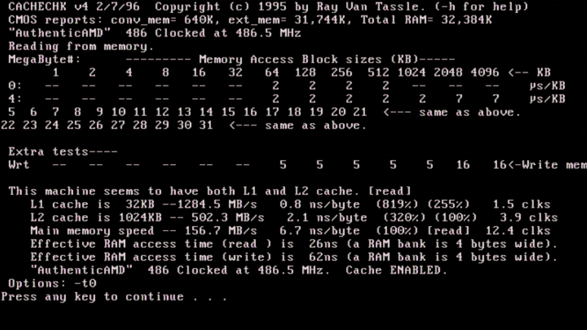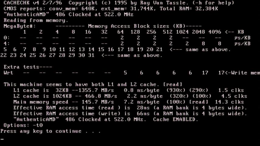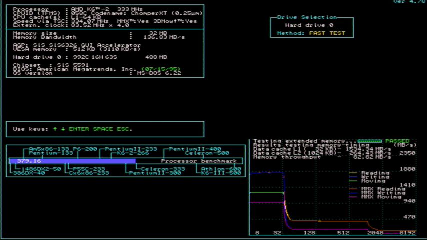 It's odd that the Front Side Bus reported itself at 90 Mhz when set to 100 MHz in the BIOS. When configured in the BIOS for a FSB of 83.3 MHz and a multiplier of 4x, SpeedSys reports the FSB and multiplier correctly, returning what you'd expect as the CPU speed: 333 MHz. Also CacheChk with the CPU at 333 MHz, FSB at 83.3 MHz with 4x mutliplier, and with the BIOS EDO/FPM RAM Speed set to 70ns: